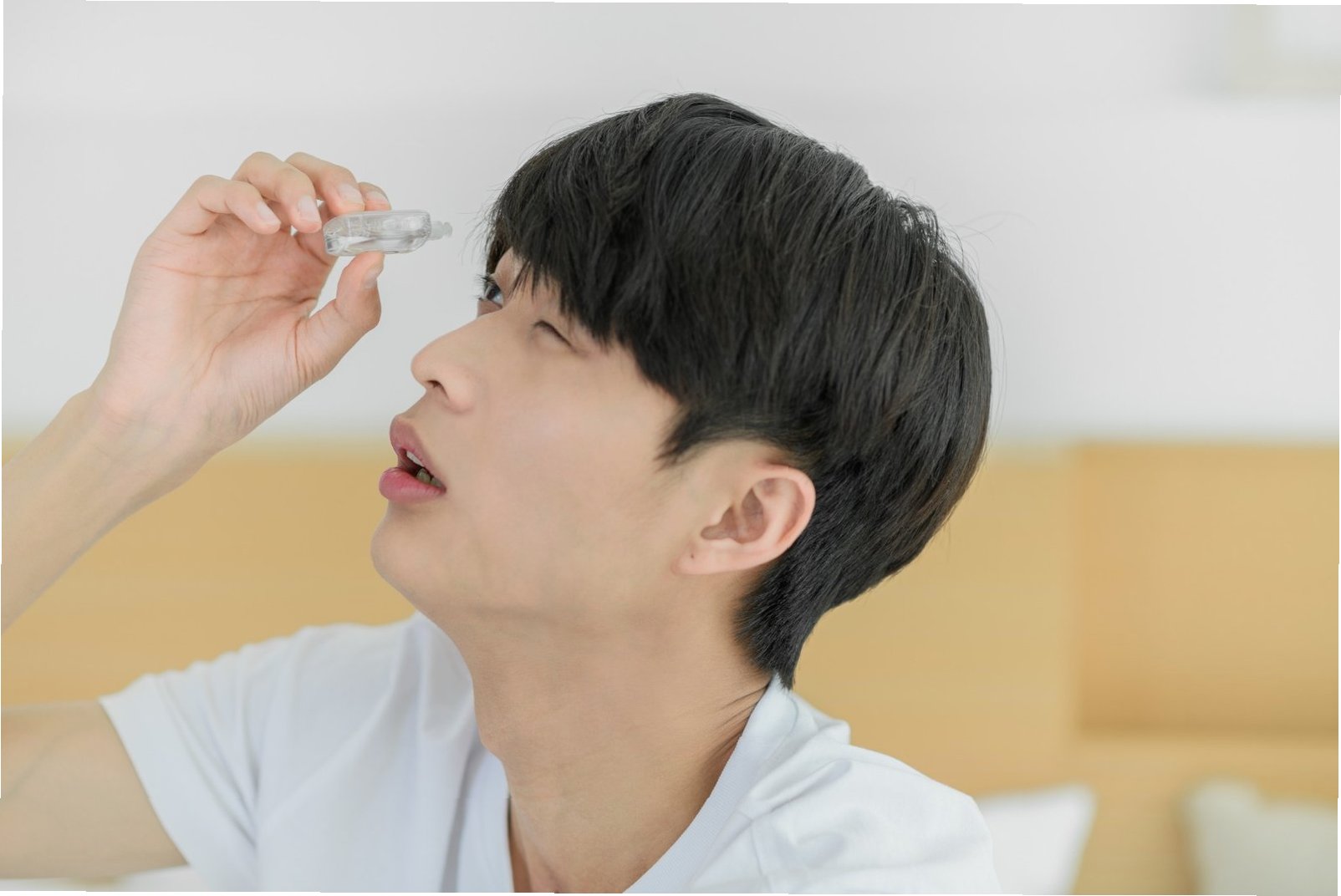3. 인공눈물 용기를 눈에 닿지 않도록 주의하며, 눈꺼풀 아래에 한두 방울을 떨어뜨립니다. 용기가 눈이나 속눈썹에 닿지 않도록 조심해야 합니다.