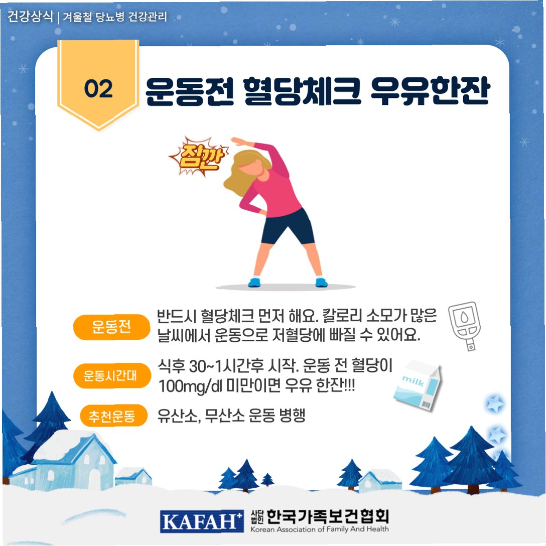 겨울철에는 실외 활동이 줄어들기 쉽지만, 꾸준한 운동은 혈당 관리에 매우 중요합니다.