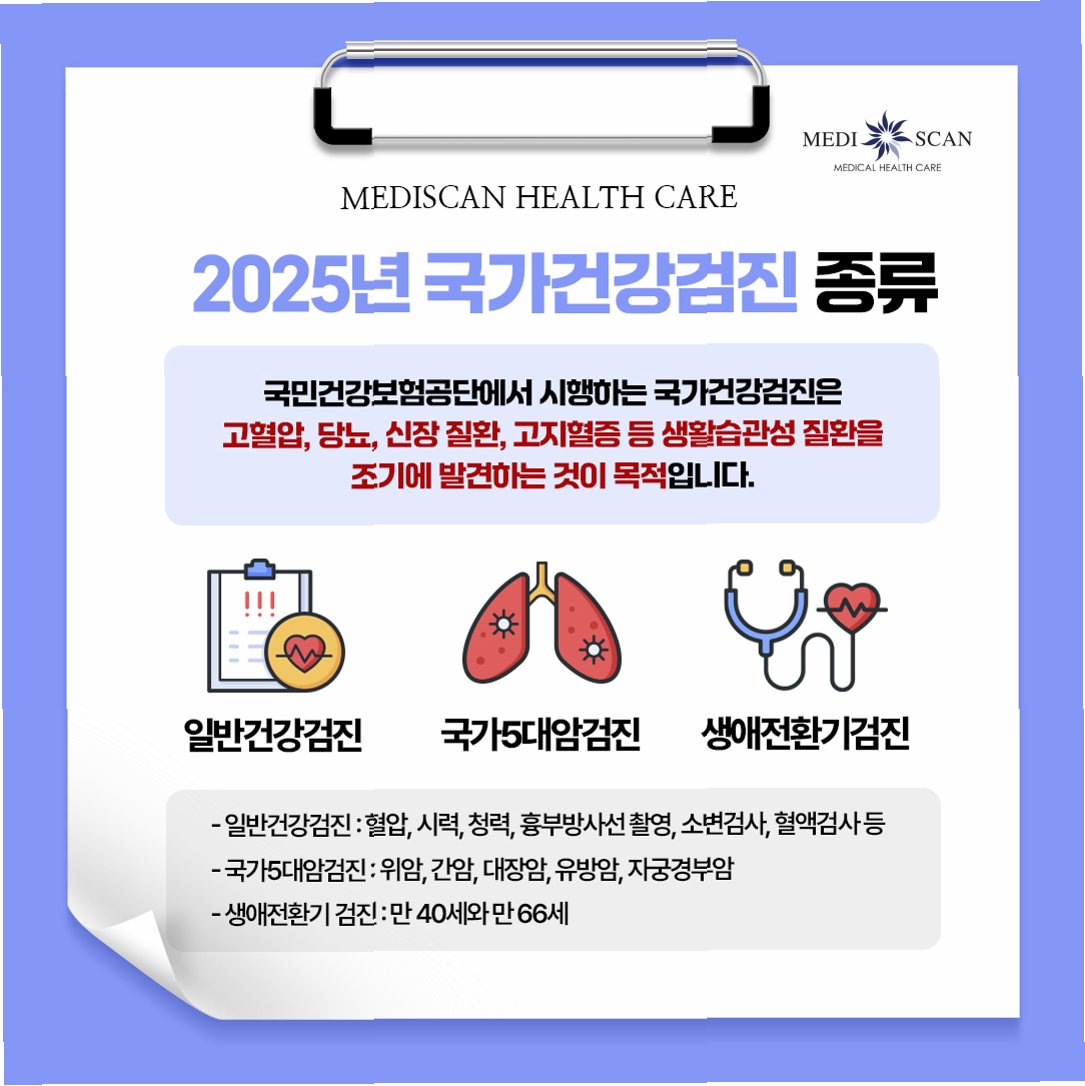 * 암 검진: 위암, 대장암, 간암, 유방암, 자궁경부암 등 (국가 암 검진 프로그램 참고)