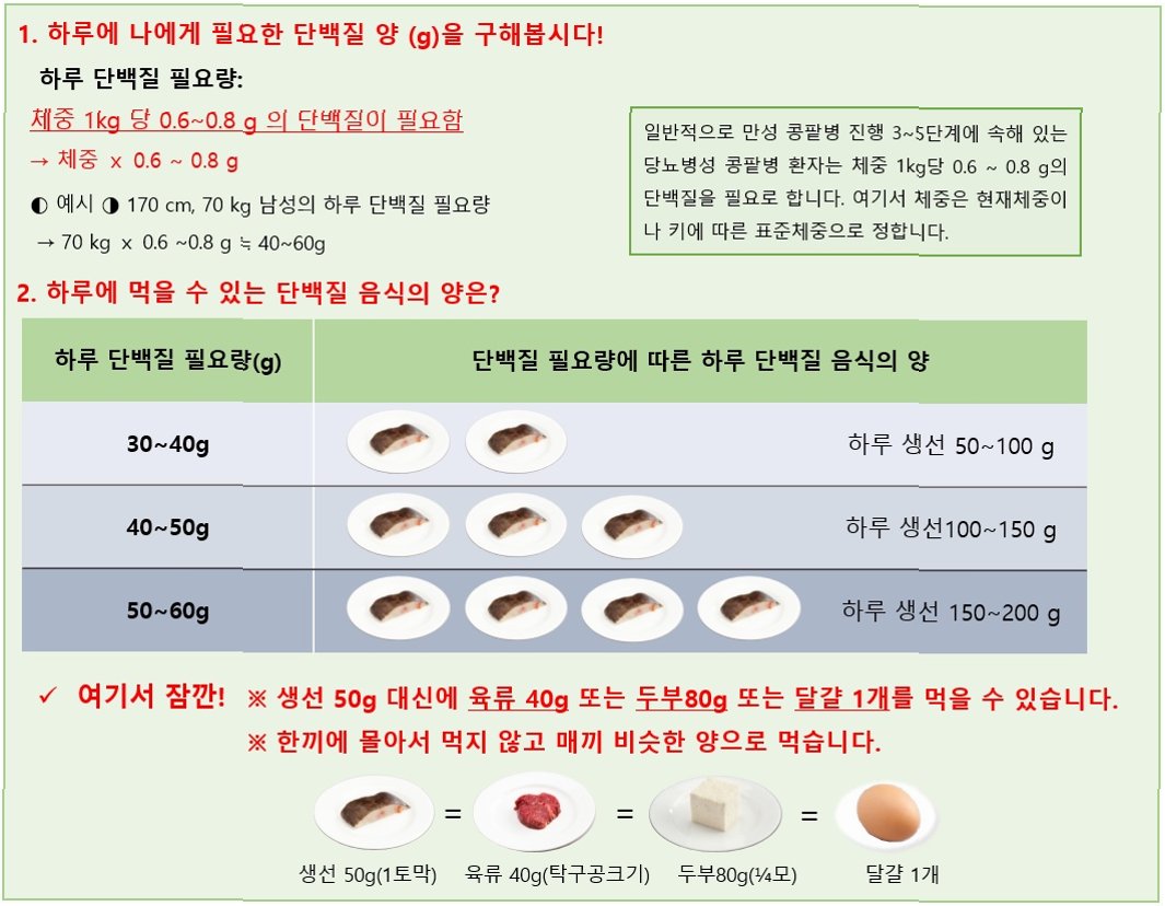 A.만성콩팥병 환자는 저단백 식단, 저염식, 인 섭취 제한 등 식이요법을 통해 신장 기능을 보호해야 합니다. 의료진 또는 영양사와 상담하여 개인에게 맞는 식단을 계획하는 것이 중요합니다. 일반적으로 과도한 단백질 섭취는 피하고, 신선한 채소와 과일을 충분히 섭취하는 것이 좋습니다.