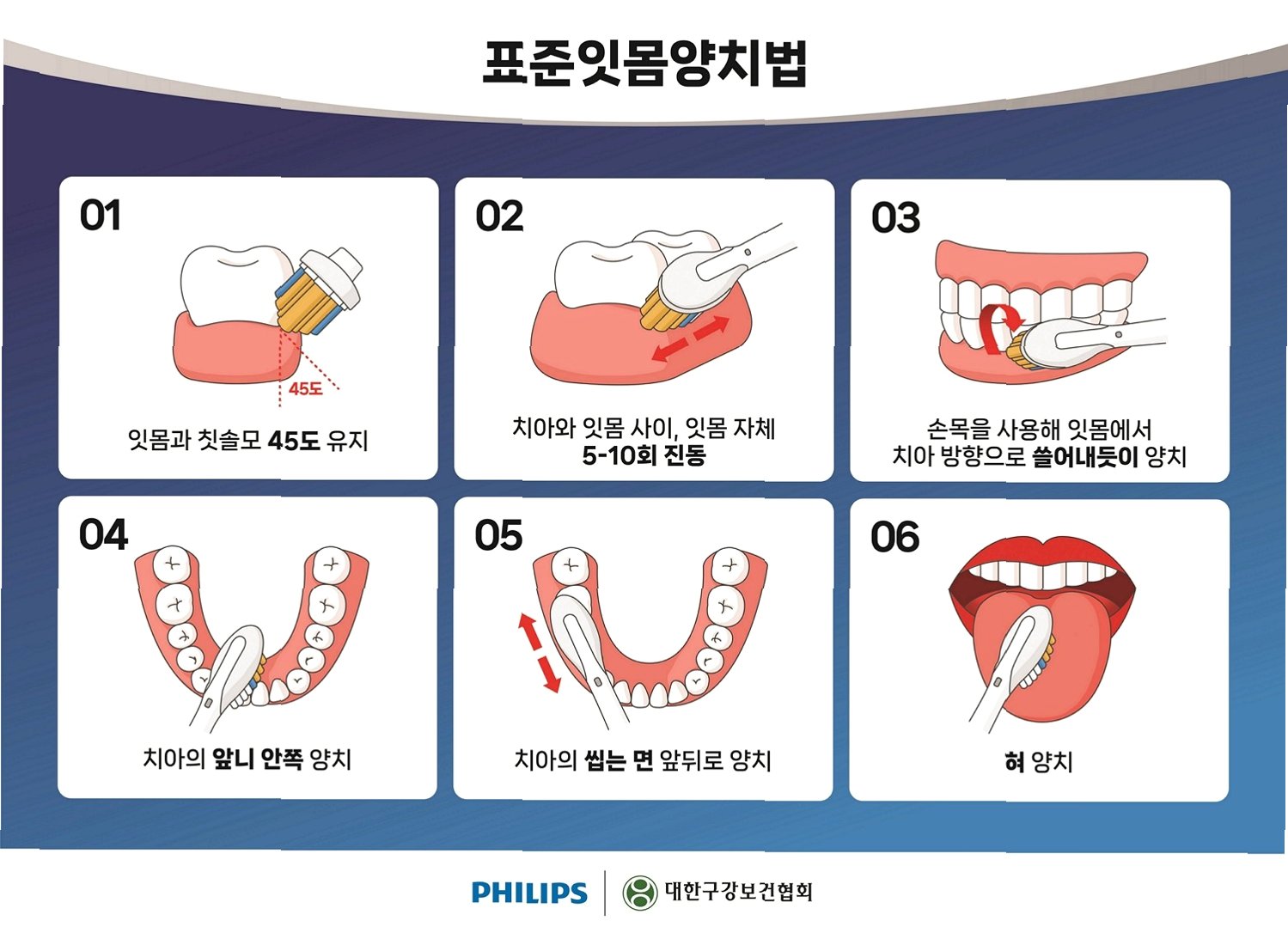 4. 칫솔질 방법: 칫솔을 45도 기울여 치아와 잇몸 경계 부위에 대고, 진동하듯 부드럽게 닦습니다. 치아의 씹는 면은 앞뒤로 움직여 닦고, 혀 클리너를 사용하여 혀를 깨끗하게 닦아줍니다.