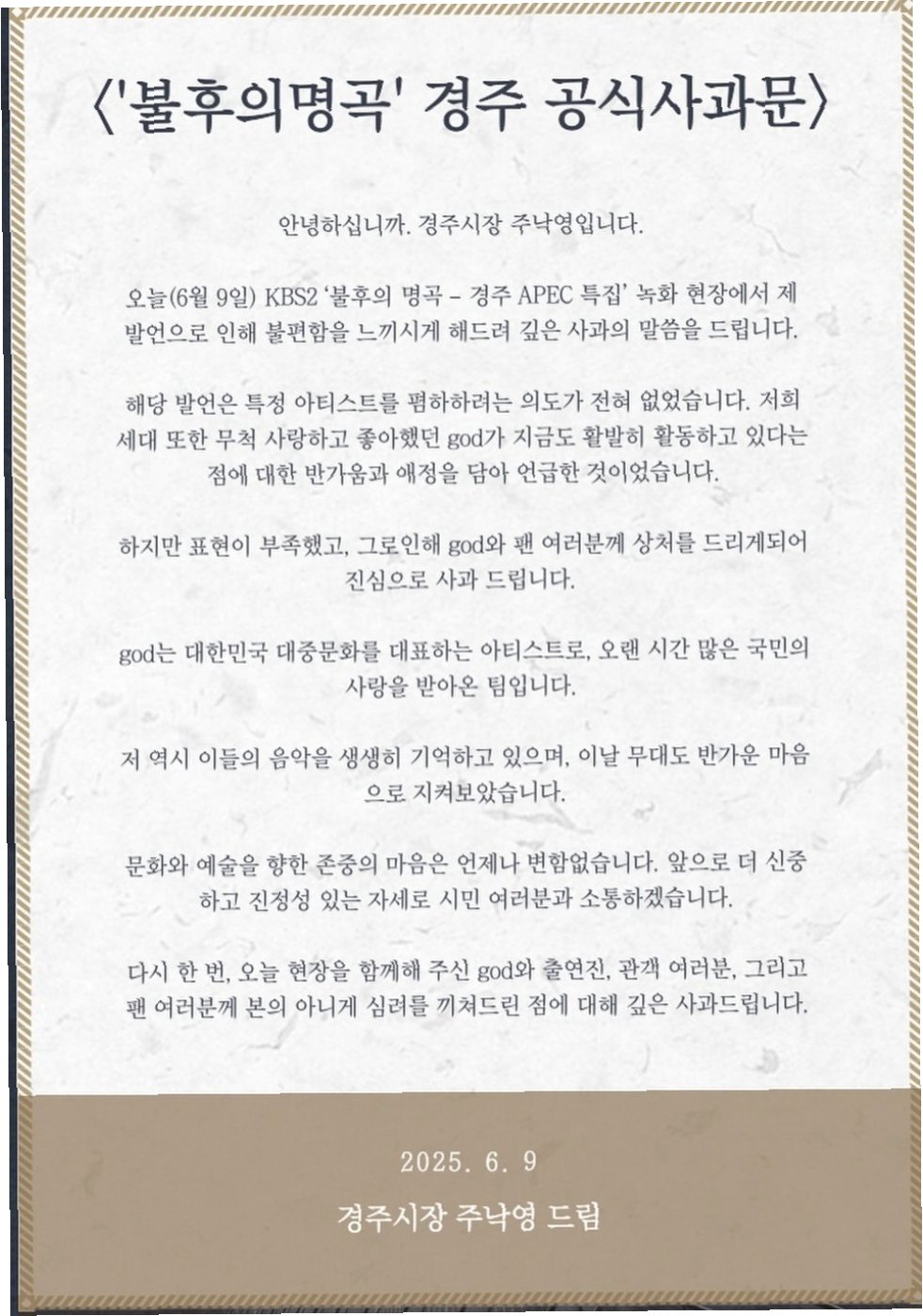논란이 커지자 주낙영 경주시장은 자신의 인스타그램에 사과문을 게시했습니다. 그는 '저희 세대 또한 무척 사랑하고 좋아했던 god가 지금도 활발히 활동하고 있다는 점에 대한 반가움과 애정을 담아 언급한 것'이라고 설명했습니다. 그러나 이러한 해명은 많은 이들에게 설득력을 주지 못했습니다. 많은 팬들은 '애정 표현이었지만 부적절한 표현'이라며 여전히 실망감을 표했습니다.