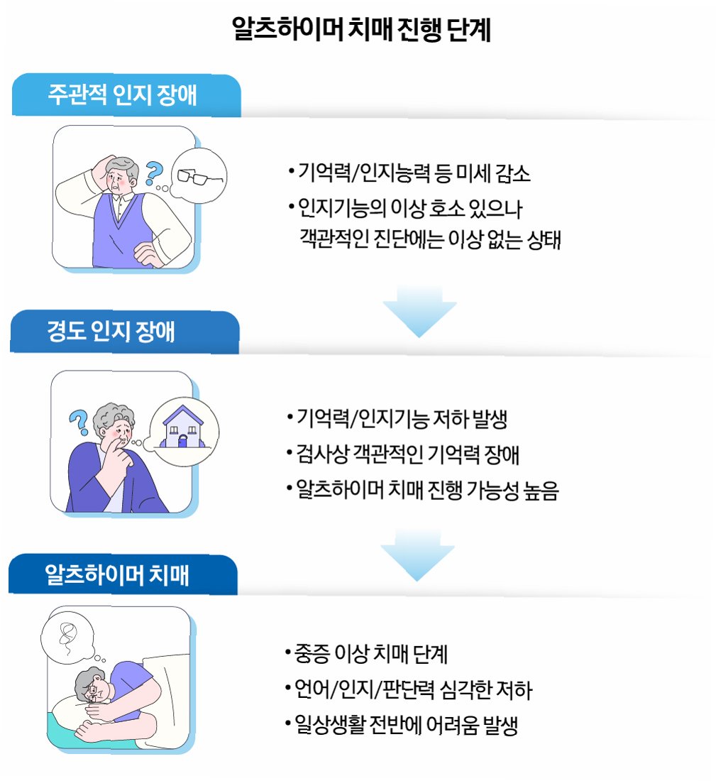 *   증상 완화 및 진행 억제: 조기 진단과 치료를 통해 인지 기능 저하 속도를 늦추고, 증상을 완화할 수 있습니다.