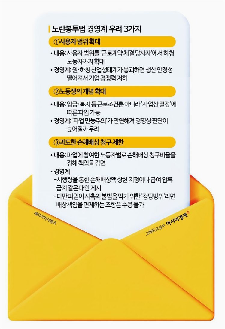 재계는 노란봉투법 통과로 인해 무분별한 파업이 부추겨져 기업 경쟁력이 약화될 것을 우려하고 있습니다. 중소기업중앙회 회장은 중소 제조 기업 중 50%가 수급 기업인 상황에서 거래 단절과 이로 인한 피해를 걱정하는 곳이 많다고 밝혔습니다. 사용자의 손해배상청구권 행사를 제한하고, 노조 활동의 배상 책임 면제를 강화한 노동법 3조 역시 중소기업들의 걱정거리입니다. 한 중소기업 대표는 “공정한 관계에서 협상이 이뤄져야 하는데 칼자루를 노조에 주고 ‘당신들 하고 싶은 대로 하라’고 하면 기업 경쟁력이 약화되는 정도가 아니라 아예 망할 수도 있다”고 강하게 비판했습니다.