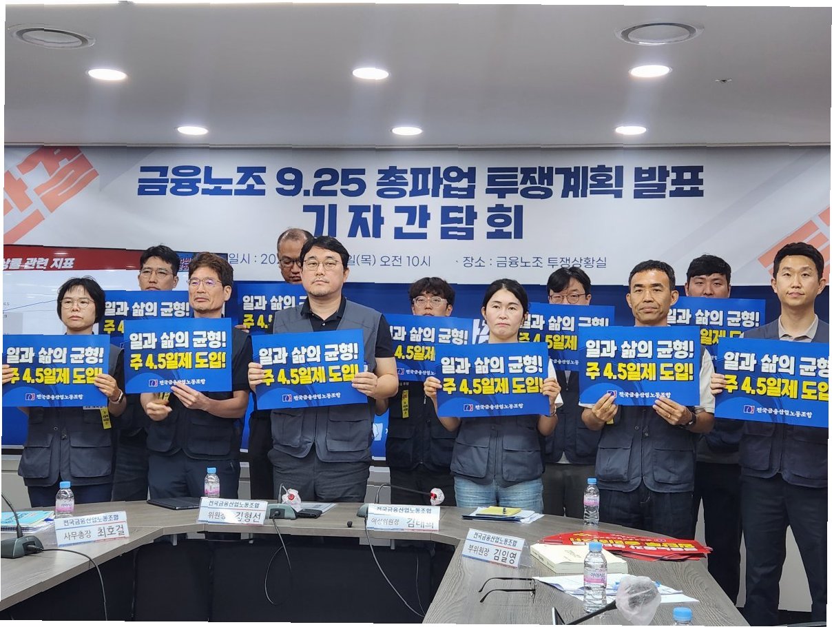 전국금융산업노동조합(이하 금융노조)이 다음 달, 주 4.5일제 근무 도입을 목표로 총파업을 예고하며 금융계에 긴장감이 감돌고 있습니다. 금융노조는 16일 결의대회를 거쳐 26일 총파업을 진행할 계획이라고 밝혔습니다. 김형선 금융노조 위원장은 주 4.5일제 도입의 필요성을 강조하며, 변화를 주도하겠다는 의지를 강력하게 드러냈습니다. 이번 파업은 단순히 근로 시간 단축을 넘어, 저출산 문제 해결과 관광산업 활성화에도 기여할 수 있다는 노조의 주장을 담고 있습니다.