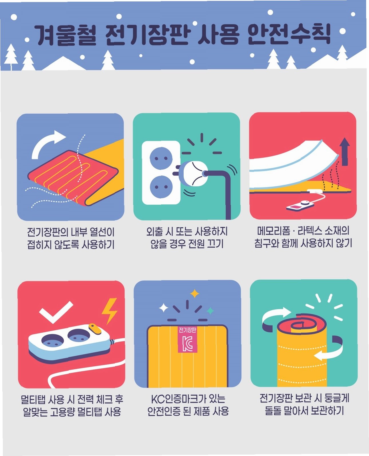 4. 무거운 물건 및 접어서 보관 금지: 전기장판 위에 무거운 물건을 올려놓거나 접어서 보관하는 행위를 피합니다.