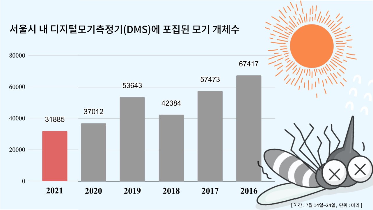 지난해 6월, 모기 활동 지수는 '100'까지 치솟았지만, 올해 6월에는 77.2가 최고치였습니다. 특히 6월 6일에는 27.4까지 떨어지는 등, 지난해와 비교해 확연한 차이를 보였습니다. 7월 10일에는 모기 활동 지수가 '0'을 기록하기도 했습니다. 이러한 모기 개체 수 감소는 지자체 방역 관련 민원 감소로도 이어졌습니다.