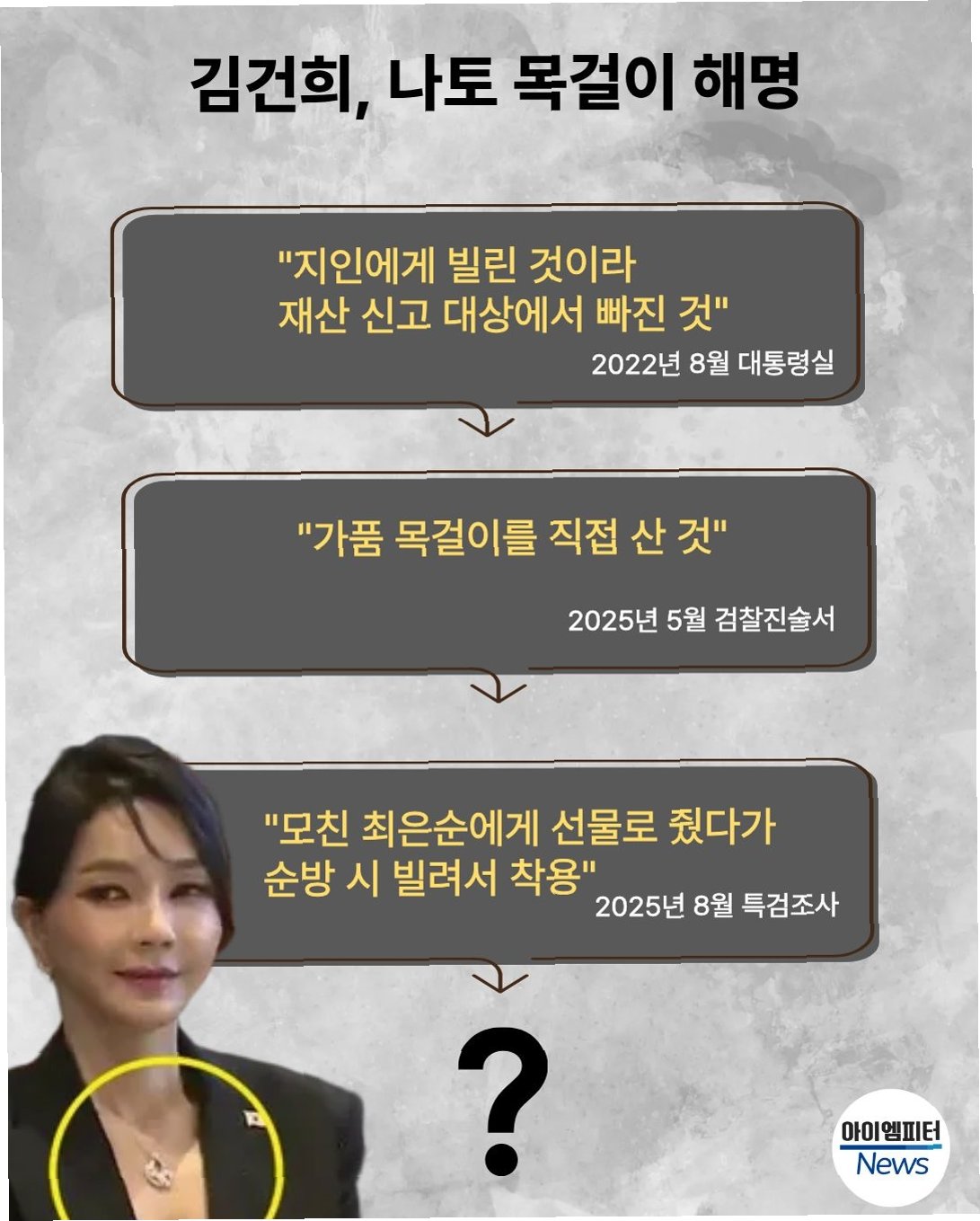 이 목걸이를 둘러싼 해명은 여러 차례 바뀌었습니다. 2022년 순방 당시에는 '지인에게 빌렸다'는 해명만 있었지만, 2년이 넘는 시간 동안 별다른 해명이 없었습니다. 그러나 윤 전 대통령 탄핵 이후 특검 수사가 시작되자, '모조품이다', '모친에게서 빌렸다'는 주장이 제기되었습니다. 이러한 변화는 진실을 감추려는 시도로 비춰질 수 있으며, 의혹을 더욱 증폭시킵니다.