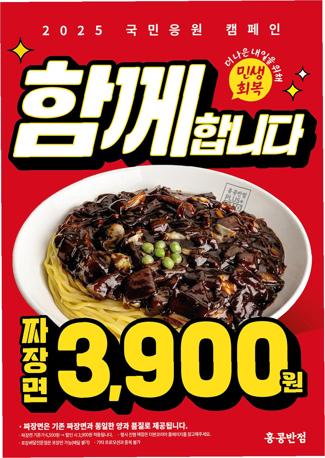 백종원 대표의 홍콩반점, 3900원 짜장면으로 민생 회복에 동참! 고객, 가맹점, 사회, 모두가 웃는 상생의 가치를 실현합니다땡겨요 제휴 할인 혜택까지! 지금 바로 홍콩반점에서 따뜻한 짜장면 한 그릇 하세요!