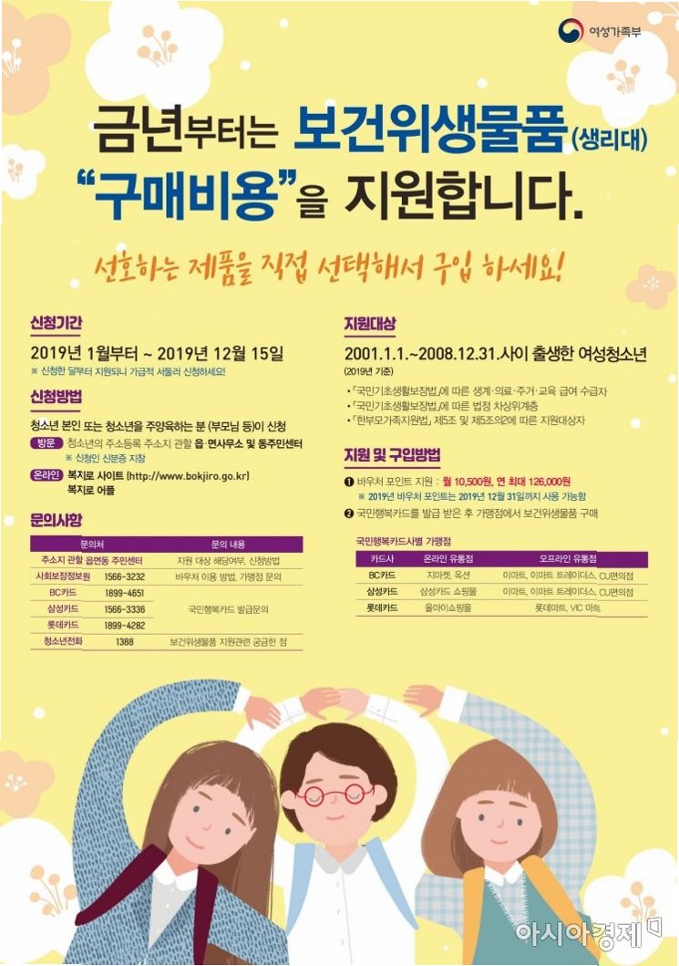 A.여성가족부의 '여성·청소년 생리용품 바우처 지원 사업'을 통해 9~24세 여성 청소년에게 월 1만 4천 원을 지원하고 있습니다. 전국 읍·면·동 행정복지센터나 온라인 사이트 '복지로'에서 신청할 수 있습니다.