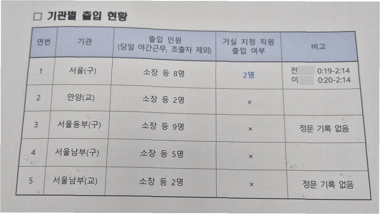 5급 이상 간부들의 비상대기 지시에도 불구하고, 서울구치소에서만 6-7급 상당의 거실 지정 담당자 2명이 심야에 출근한 것은 의문을 자아냅니다. 이들은 국회의 계엄 해제 의결 1시간 10분 뒤에 퇴근했는데, 이는 단순히 수용 여력을 확인하기 위한 목적이었다고 보기 어렵다는 시각이 지배적입니다.