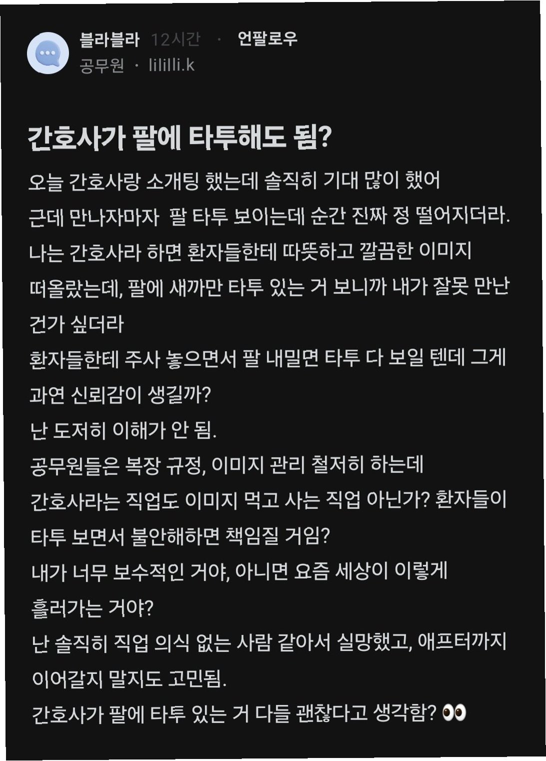 글쓴이 A씨는 공무원으로서, 소개팅에서 만난 간호사에게 큰 기대를 걸었습니다. 하지만 첫 만남에서 팔에 새겨진 타투를 본 순간, 실망감을 감출 수 없었다고 합니다. 그는 간호사에게서 기대했던 '따뜻하고 깔끔한 이미지'와는 상반된 모습에 당황했고, 자신이 잘못된 사람을 만난 것이 아닌가 하는 생각까지 했다고 토로했습니다. A씨는 간호사라는 직업의 특성상, 환자들에게 긍정적인 이미지를 주는 것이 중요하다고 생각하며, 타투가 환자들에게 부정적인 영향을 미칠 수 있다고 우려했습니다.
