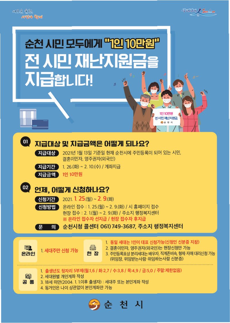 A.네, 순천시의 모든 시민에게 1인당 20만원씩 지급될 예정입니다.