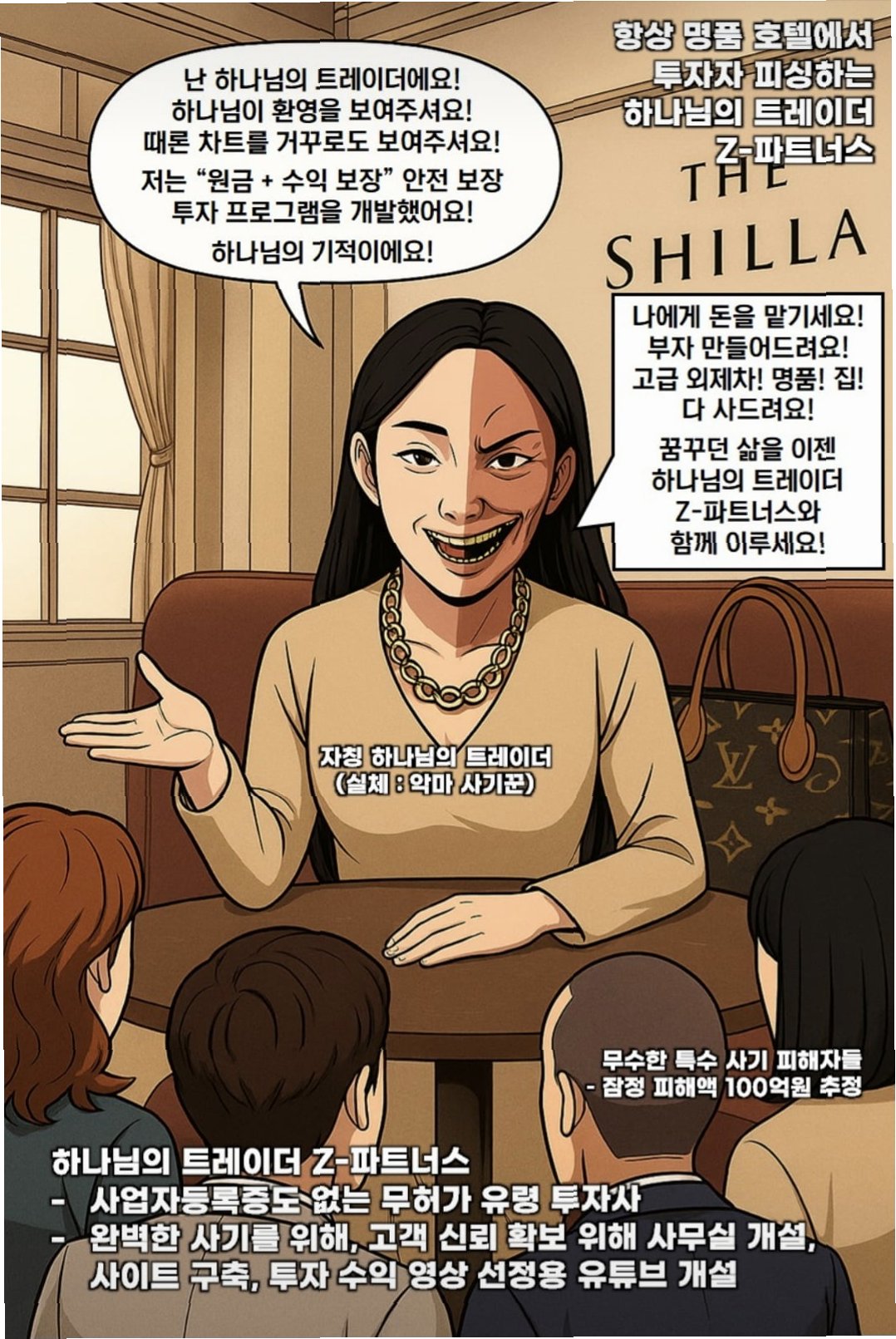 A.박씨는 종교적 신앙심을 이용해 '하나님이 주신 차트'로 매매한다는 허황된 주장을 펼쳤습니다. 또한, 심리적으로 취약한 이혼녀, 장애인 등을 표적으로 삼아 가스라이팅을 통해 조종하고, 호화로운 생활을 과시하며 투자를 유도했습니다.