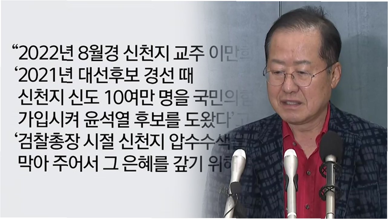 A.홍준표 전 대구시장은 2021년 국민의힘 대선 경선 당시 신천지 신도들이 조직적으로 윤석열 후보를 도왔다는 의혹을 제기했습니다. 이만희 교주와의 만남, 신천지 신도의 조직적 동원, 압수수색 방해 등이 주요 내용입니다.