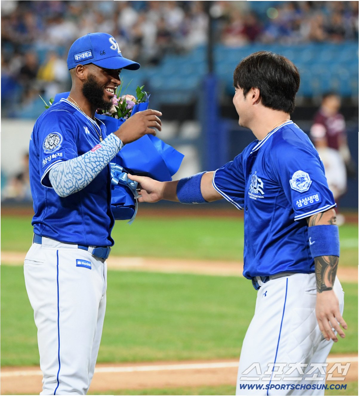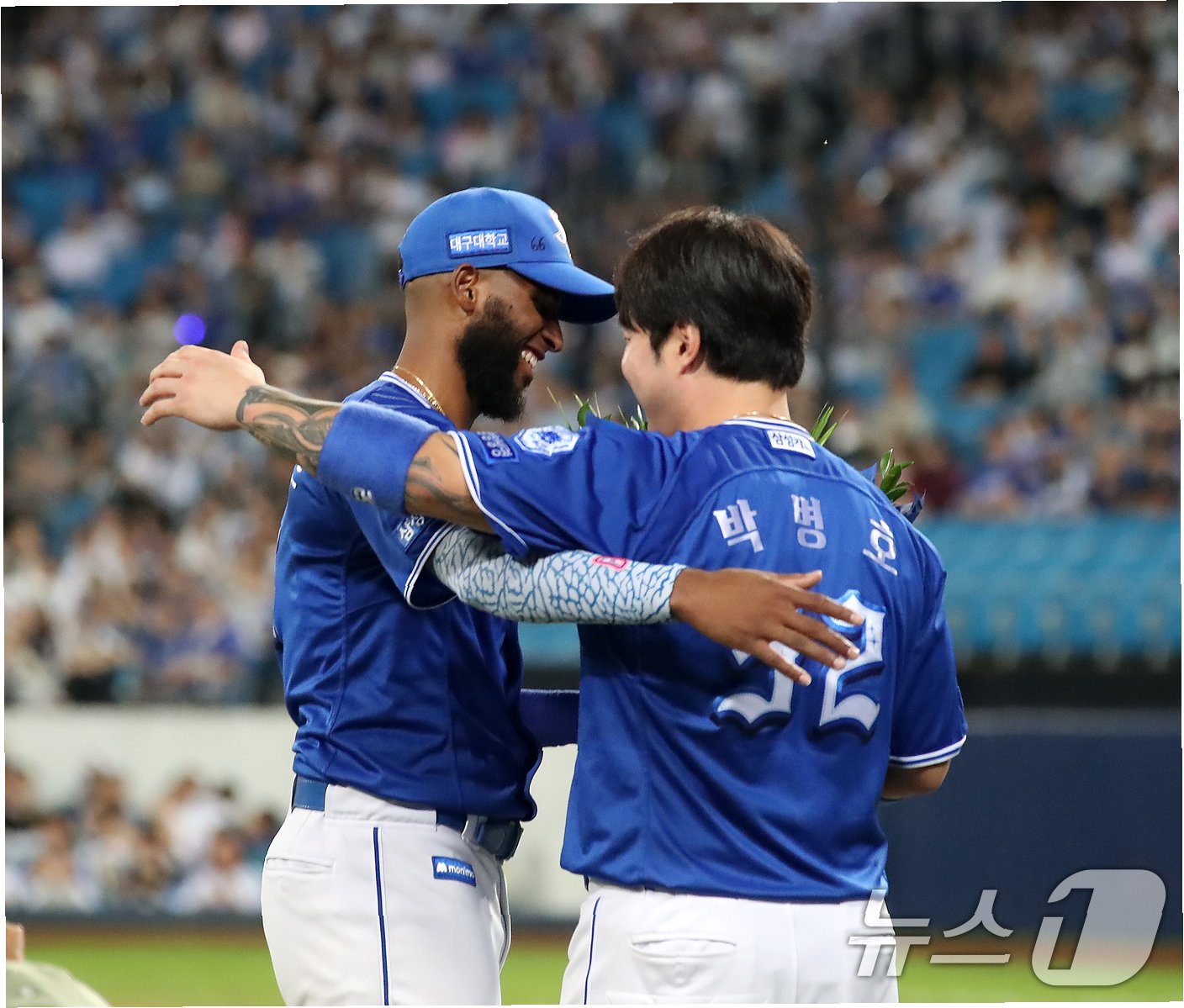 A.박병호는 디아즈에게 꽃다발을 건네고 뜨거운 포옹을 나누며, 진심으로 축하했습니다.