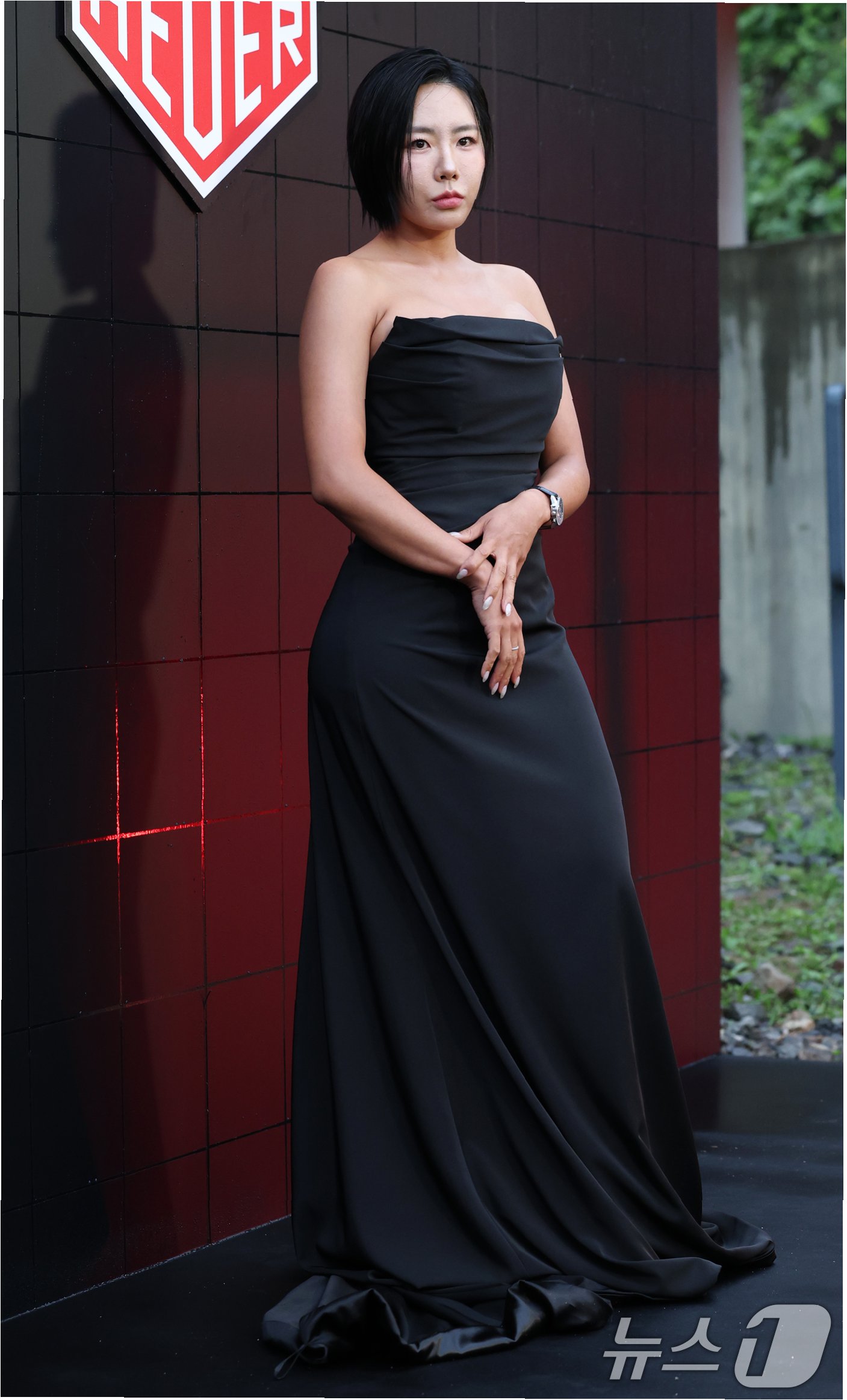 이상화는 심플하면서도 세련된 블랙 튜브톱 롱 드레스를 선택했습니다. 과감하게 드러낸 어깨 라인과 절제된 실루엣은 그녀의 자신감을 드러내는 듯했습니다. 상체 셔링 디테일은 우아함을 더했고, 밑단으로 자연스럽게 퍼지는 드레스 라인은 여성스러운 매력을 극대화했습니다. 블랙 컬러는 이상화의 세련된 이미지를 더욱 돋보이게 하며, 어떤 액세서리보다 드레스 자체의 아름다움을 강조했습니다.