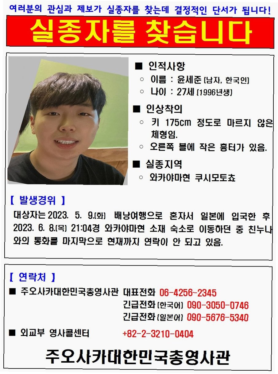 2023년 6월 8일, 윤세준 씨는 누나에게 ‘숙소에 잘 도착했다’는 문자를 마지막으로 연락이 끊겼습니다. 그 후 1년 9개월이 넘도록 그의 행방은 묘연하며, 사건은 미궁 속에 빠졌습니다. 강원도 원주 출신의 윤 씨는 서울에서 사회복지관 근무를 마치고 휴식을 위해 떠난 일본 여행 중 실종되었습니다.