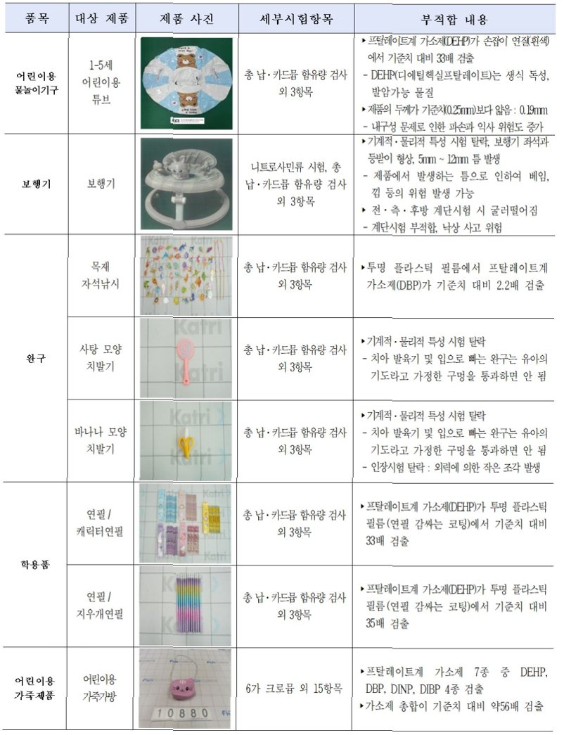 A.프탈레이트계 가소제, 납, 폼알데하이드 등 아이들의 건강에 해로운 물질들이 검출되었습니다.