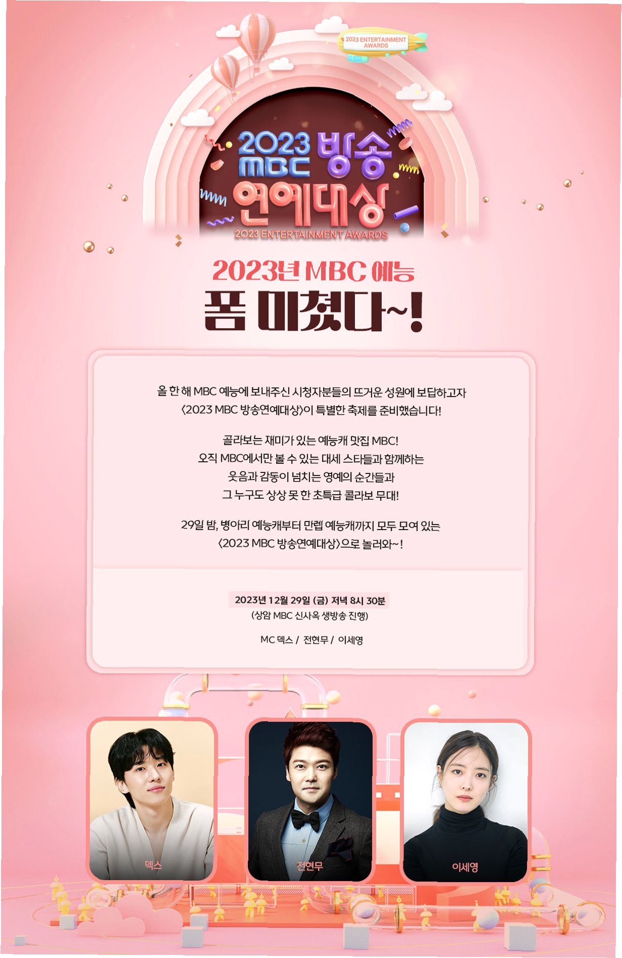 2025 MBC 방송연예대상은 전현무, 장도연의 환상적인 호흡과 파격적인 변신, 그리고 예상치 못한 변수들로 인해 더욱 기대감을 높이고 있습니다. MBC 원더랜드에서 펼쳐질 예능인들의 즐거운 축제는 시청자들에게 잊지 못할 연말을 선사할 것입니다. 29일 오후 8시 50분에 방송될 2025 MBC 방송연예대상을 통해, 한 해 동안 시청자들에게 웃음과 감동을 선사한 예능인들을 만나보세요.
