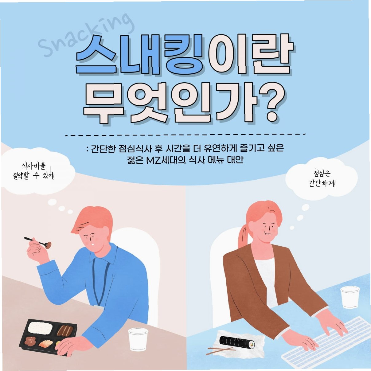 과거 부서원들이 단체로 백반이나 김치찌개를 먹던 모습 대신, MZ세대를 중심으로 혼자 간편식으로 점심을 해결하고 나만의 시간을 갖는 ‘스내킹(Snacking)족’이 증가하는 추세다.