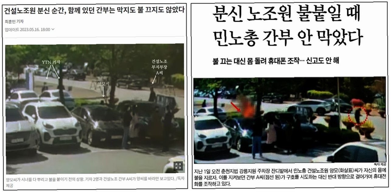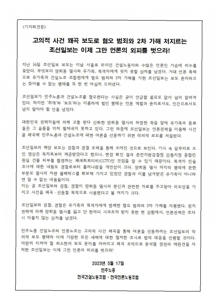 2023년 5월 1일, 양회동 씨는 윤석열 정부의 '건설노조 탄압'에 항의하며 분신했습니다. 이후 조선일보와 자회사 조선엔에스는 '양씨의 죽음을 건설노조 간부가 방조했다'는 취지의 허위 보도를 했습니다. 이 보도는 원희룡 전 국토교통부 장관의 '음모론' 가담과 월간조선의 '유서 대필 의혹' 제기로 이어지며 큰 파장을 일으켰습니다.