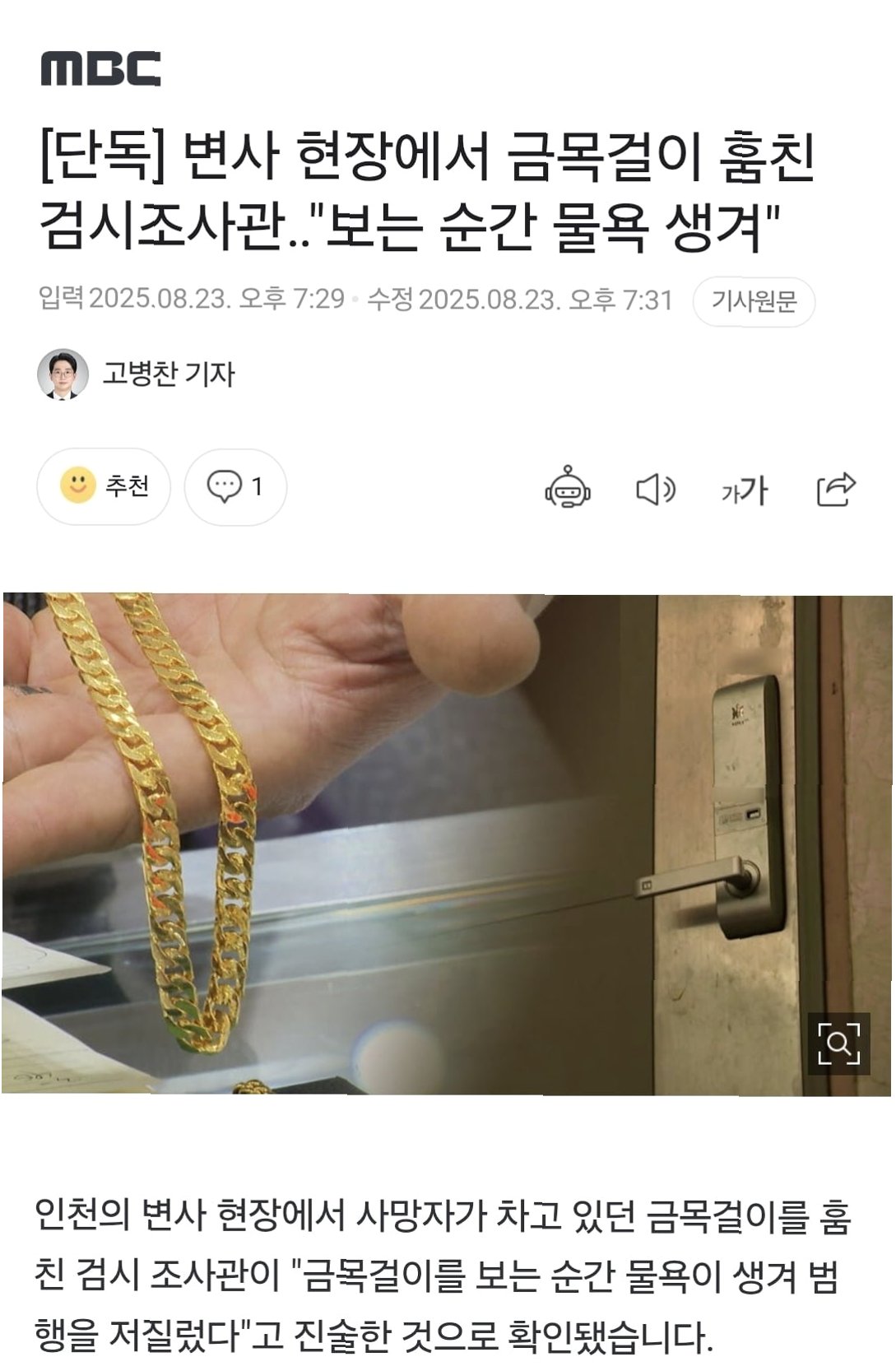 검시 조사관이 숨진 남성의 금목걸이를 절도한 사건은, 현장 검증 과정에서의 허점을 파고든 치밀함과 '물욕'이라는 인간 본성의 어두운 면을 드러냅니다. 이 사건은 사회적 신뢰를 저버린 행위로, 철저한 수사를 통해 진실을 밝혀야 할 것입니다.