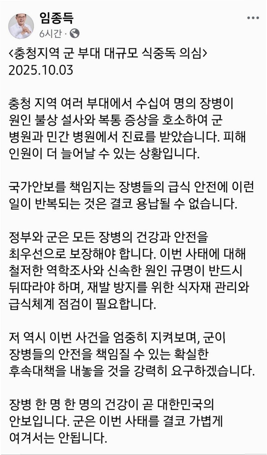 충북 지역뿐만 아니라, 충남 보령, 태안, 대전, 세종 등지에서도 50여 명의 장병들이 식중독 의심 증세를 보였습니다. 이는 식중독의 확산 가능성을 시사하며, 군 당국의 긴장감을 높이고 있습니다. 군 당국은 각 부대별로 식자재, 배송 과정, 식수 상태 등을 면밀히 확인하며, 추가적인 피해를 막기 위해 총력을 기울이고 있습니다. 또한, 식중독 의심 환자들의 건강 상태를 지속적으로 모니터링하고, 필요한 의료 지원을 제공하고 있습니다. 이번 사건을 통해 군 급식 시스템 전반에 대한 점검과 개선이 이루어질 필요가 있습니다. 군 당국은 추가적인 피해를 막기 위해, 모든 가능성을 열어두고 철저한 조사를 진행할 것입니다.