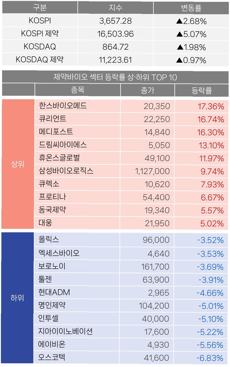 주요 종목별 희비 교차, 삼성전자만 하락