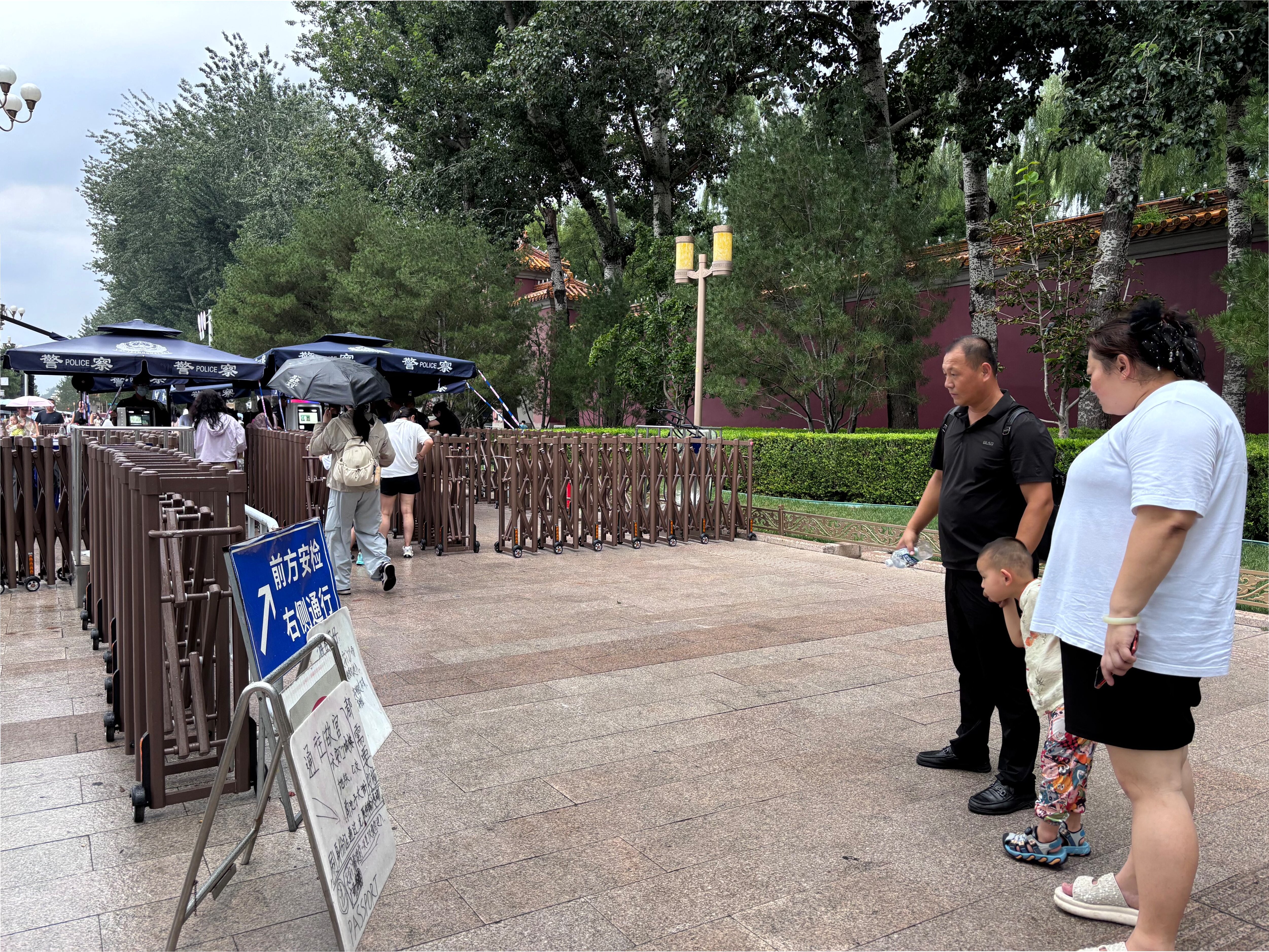 A.열병식의 안전을 위해 톈안먼 광장 인근에서 소지품 검사가 강화되었습니다.
