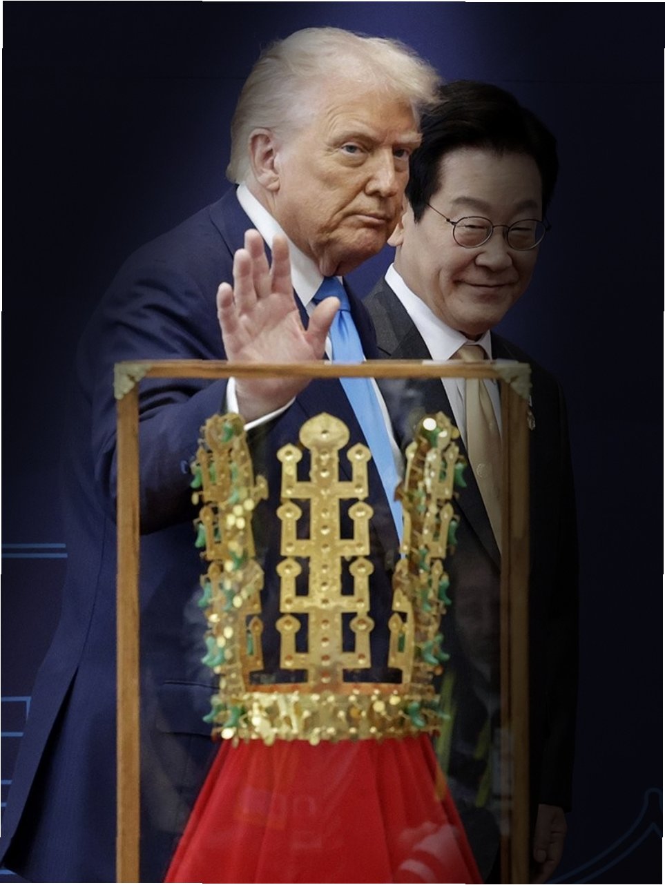 트럼프 대통령이 이재명 대통령으로부터 선물 받은 신라 천마총 금관 모형은 이번 AI 영상의 핵심 소재로 등장하며, 단순한 외교 선물을 넘어 정치적 상징으로 부상했습니다. 이 금관은 트럼프 대통령의 권위주의적 통치를 비판하는 '노 킹스' 시위가 한창인 시점에 전달되었다는 점에서 더욱 의미심장합니다. 대통령실은 이 선물의 의미에 대해 '신라가 한반도에 평화를 가져온 정신을 상징하며, 한미동맹의 황금기를 기념하기 위한 것'이라고 밝혔습니다. 하지만 일각에서는 이러한 선물이 트럼프 대통령의 권력욕을 더욱 부추길 수 있다는 우려도 제기되고 있습니다. 이러한 논란 속에서 신라 금관은 한미 관계의 복잡한 역학 관계와 정치적 메시지를 담아내는 중요한 매개체가 되었습니다.