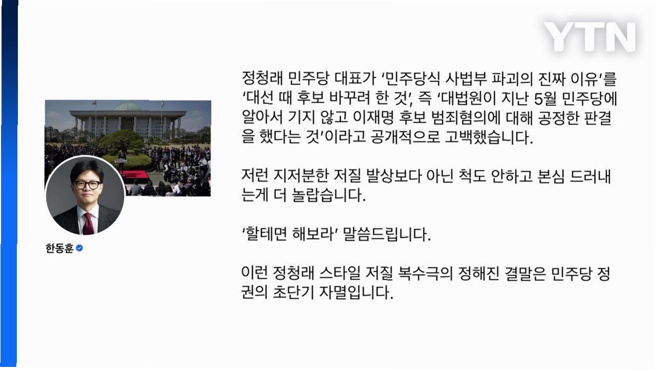 정청래 대표의 '사법개혁은 자업자득' 발언에 한동훈 전 대표가 '할 테면 해보라'며 강력하게 반발, 정치권 갈등 심화. 이재명 관련 판결이 배경, 사법부 독립성 훼손 우려. 향후 정치 지형에 영향 예상.
