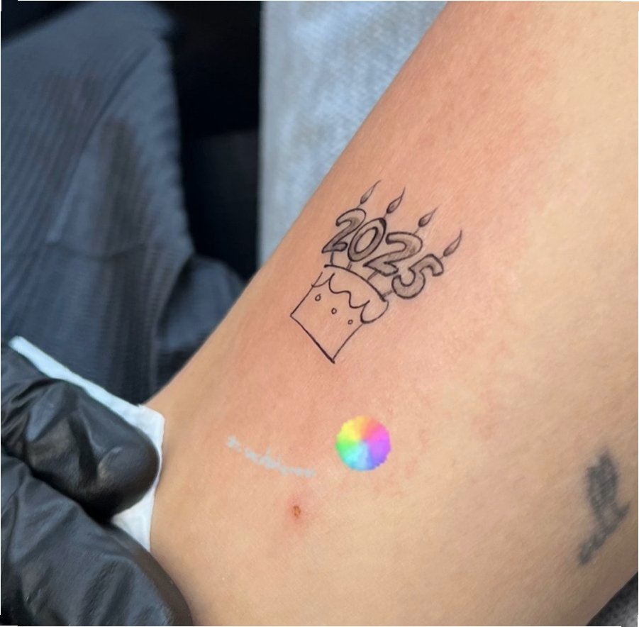 A.한예슬은 2025라는 숫자 초가 꽂힌 케이크 타투를 새겼으며, 이는 미래에 대한 기대와 긍정적인 마음을 표현하는 상징적인 의미를 담고 있습니다.