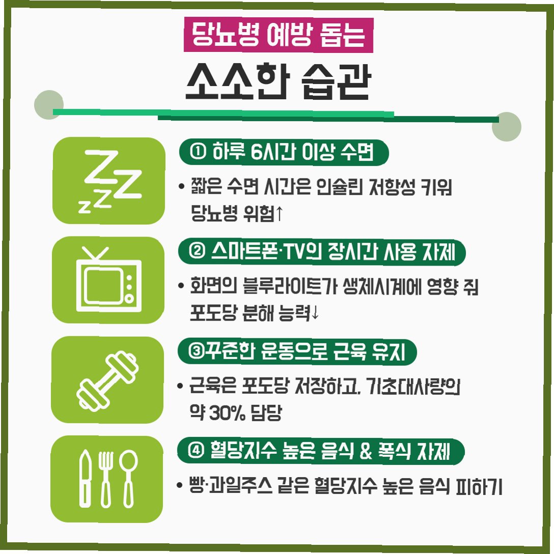 A.정제 탄수화물(흰 빵, 떡, 면류, 과자 등), 설탕이 많이 함유된 음료, 가공식품 등을 과도하게 섭취하는 것을 피해야 합니다.