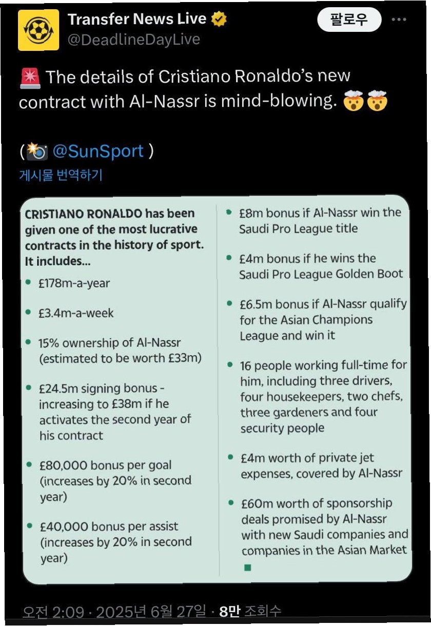 영국 공영방송 BBC의 보도에 따르면, 이번 재계약은 호날두에게 엄청난 부를 안겨줄 것으로 보입니다연봉 1억 7800만 파운드(약 3317억 원)에 주급 340만 파운드(약 63억 원)는 웬만한 선수 이적료를 일주일 만에 버는 수준입니다또한, 알나스르 구단 지분 15% 양도, 득점 및 도움 보너스, 득점왕 보너스 등 개인 기록에 따른 '가욋돈' 역시 상당합니다.