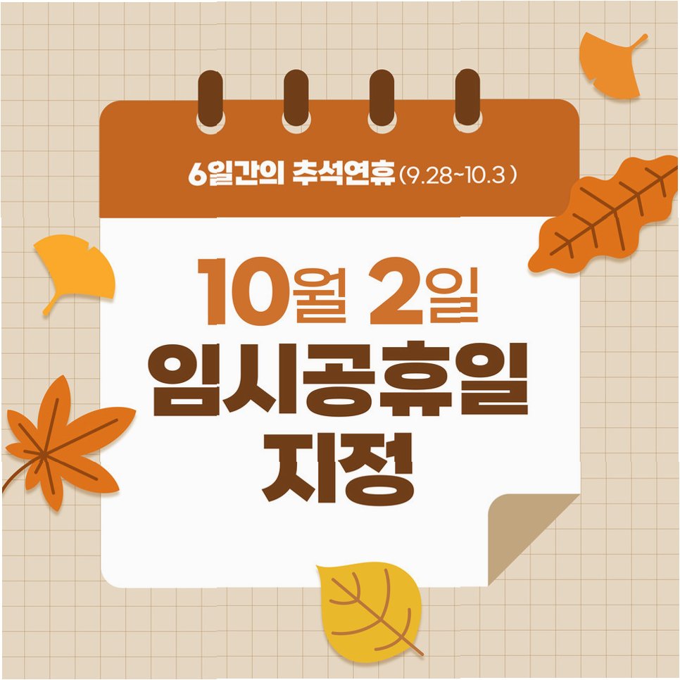 다가오는 추석 연휴, 개천절, 한글날, 대체공휴일이 맞물려 벌써부터 마음이 설레는 분들이 많으실 텐데요. 여기에 10일을 임시공휴일로 지정하여 열흘간의 황금연휴를 기대하는 목소리도 높았습니다. 하지만, 정부가 10월 10일 임시공휴일 지정을 검토하지 않는다는 소식에 아쉬움을 표하는 분들이 많습니다. 10일간의 꿀맛 같은 휴식을 꿈꿨던 많은 분들의 기대가 무산될 위기에 놓인 것입니다.