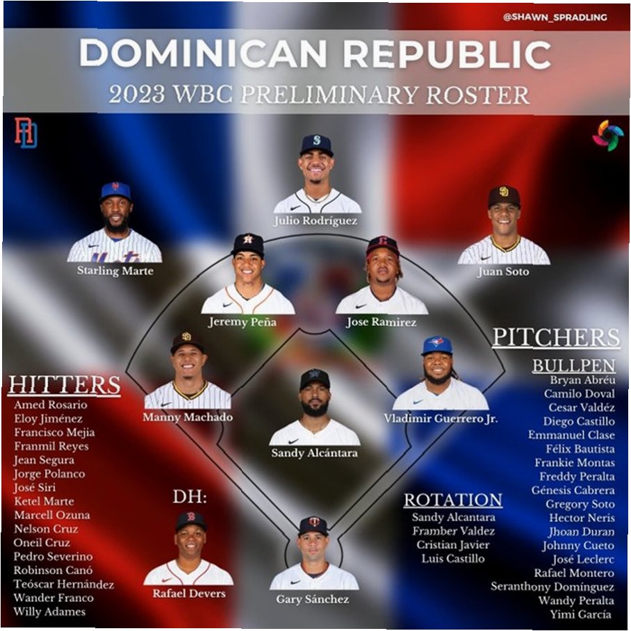 도미니카공화국 대표팀에는 게레로 주니어(토론토 블루제이스), 후안 소토(뉴욕 메츠), 페르난도 타티스 주니어, 매니 마차도(이상 샌디에이고 파드리스), 주니오르 카미네로(탬파베이 레이스), 케텔 마르테(애리조나 다이아몬드백스), 훌리오 로드리게스(시애틀 매리너스), 엘리 데 라 크루즈(신시내티 레즈) 등 MLB를 대표하는 선수들이 대거 포함되었다. 특히 게레로 주니어는 2021년 홈런왕을 차지하고, 5년 연속 20홈런 이상을 기록하는 등 최고의 기량을 선보이고 있다. 이러한 선수들의 면면은 도미니카공화국이 이번 대회에서 강력한 우승 후보임을 시사한다.