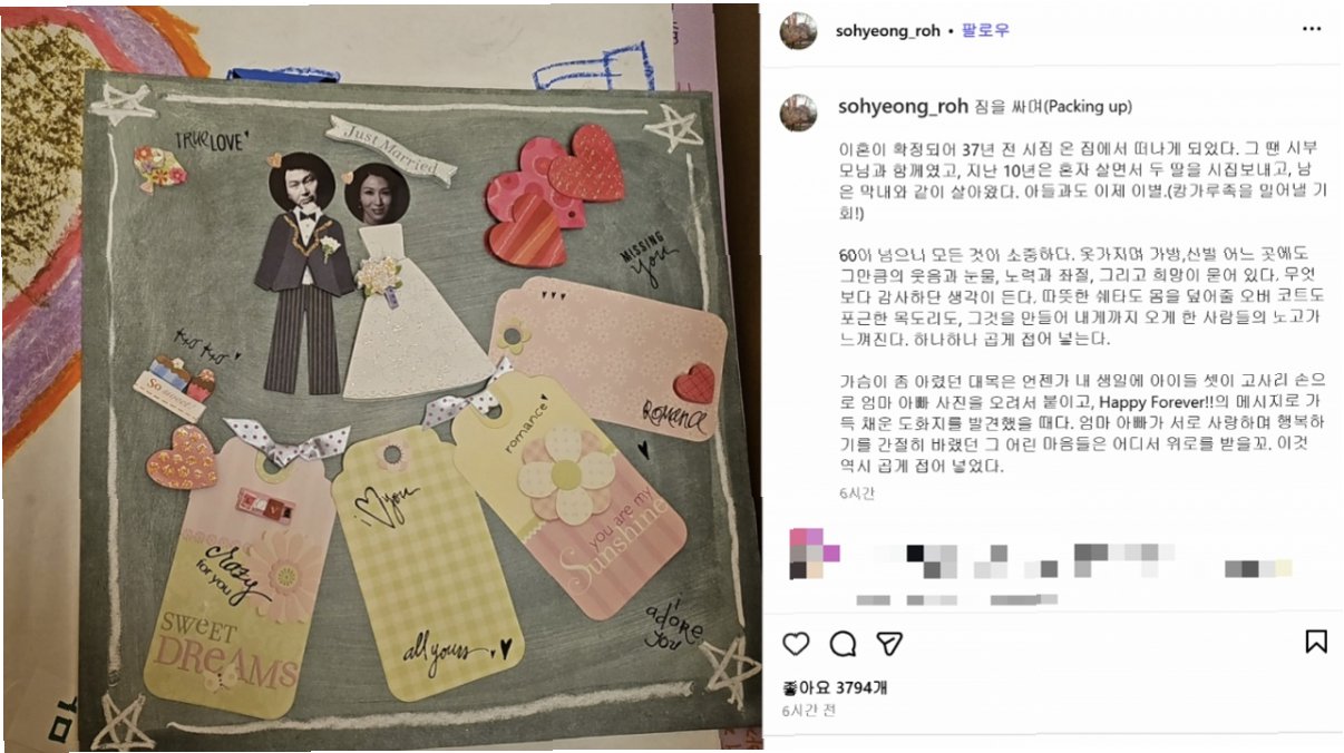 최태원 SK그룹 회장과의 이혼이 확정된 노소영 아트센터 나비 관장이 6일 SNS를 통해 37년 전 시집온 집을 떠나는 심경을 밝혔습니다. 그녀는 자신의 인스타그램에 “이혼이 확정돼 37년 전 시집온 집에서 떠나게 됐다”는 글을 게시하며, 지난 시간을 회상했습니다. 시부모님과 함께 시작된 결혼 생활, 두 딸을 시집보내고 막내와 함께 지낸 시간들, 그리고 아들과의 이별까지, 노 관장은 지난 세월의 깊이를 담담하게 표현했습니다.