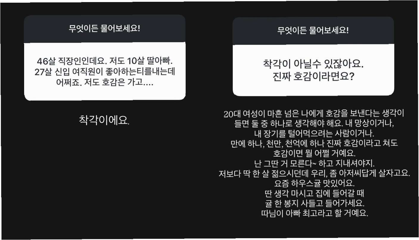유명 번역가 황석희는 이 고민에 대해 매우 단호한 답변을 내놓았습니다. 그는 A씨의 질문에 “착각이다”라는 짧고 굵은 한마디로 답하며, 상황에 대한 명확한 시각을 제시했습니다. 황석희는 A씨가 착각할 수 있는 가능성을 지적하며, 현실적인 조언을 아끼지 않았습니다. 그의 답변은 많은 이들에게 깊은 인상을 남겼습니다.
