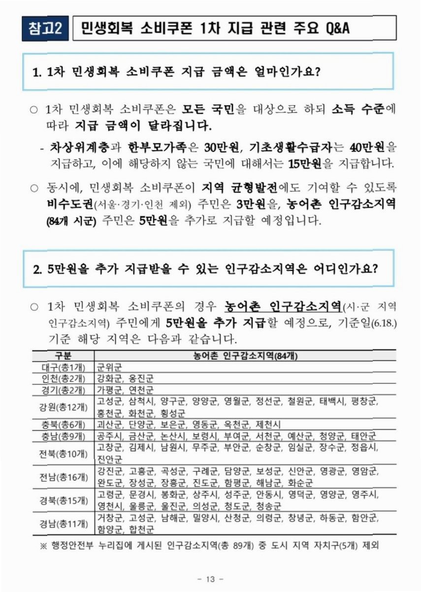 정부는 도(道)의 시·군과 특별·광역시의 구(區)는 생활권의 특성에 차이가 있다는 점을 고려했다고 설명했습니다. 도 지역의 시·군은 생활권이 뚜렷하게 구분되는 반면, 상대적으로 도시화된 특·광역시의 구는 서로 같은 생활권으로 묶이는 경우가 많아 이에 따른 소비 진작 효과의 차이를 고려해야 한다는 것입니다.