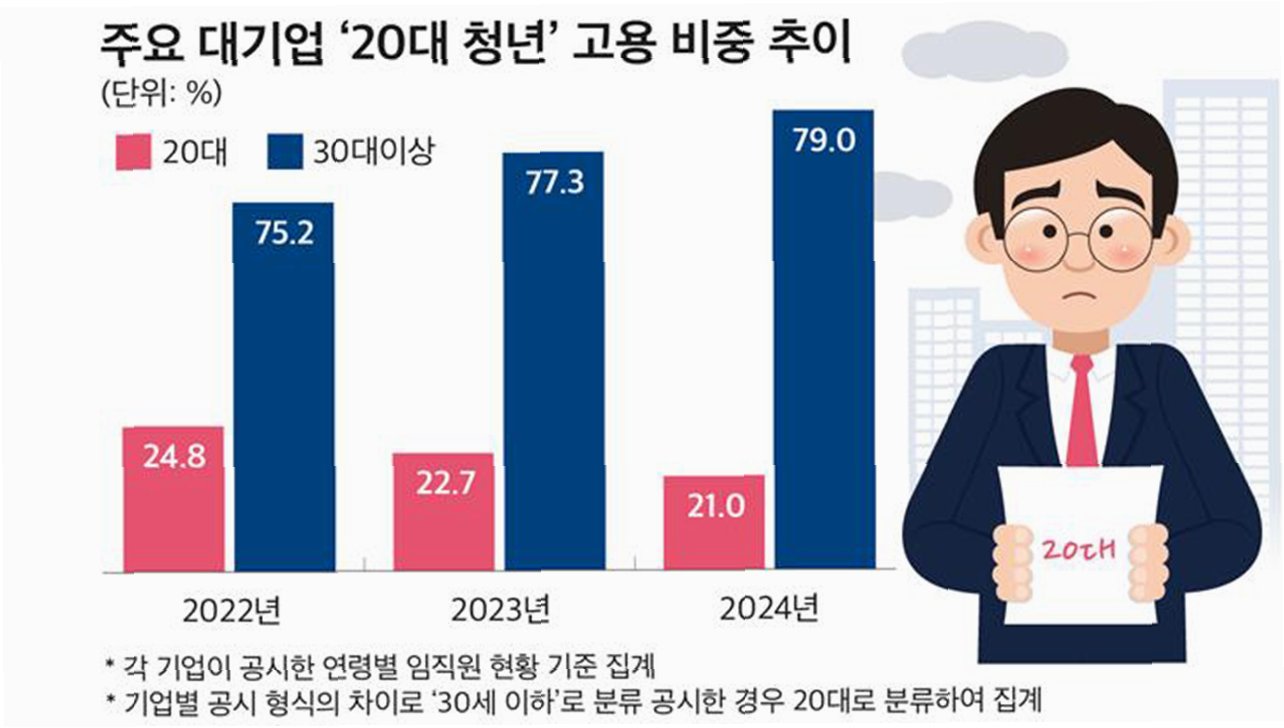 기업데이터연구소 CEO스코어의 조사에 따르면, 20대 직원의 비중이 2년 만에 25%에서 21%로 급락했습니다. 숫자로 보면 4만 7천 명 이상이 줄어든 셈입니다. 삼성전자와 SK하이닉스, 네이버 등에서도 20대 직원 비중이 감소하며, 젊은 인재들이 설 자리를 잃어가고 있는 안타까운 현실을 보여주고 있습니다. 이러한 현상은 기업의 혁신 저해는 물론, 국가 경쟁력 약화로 이어질 수 있습니다.