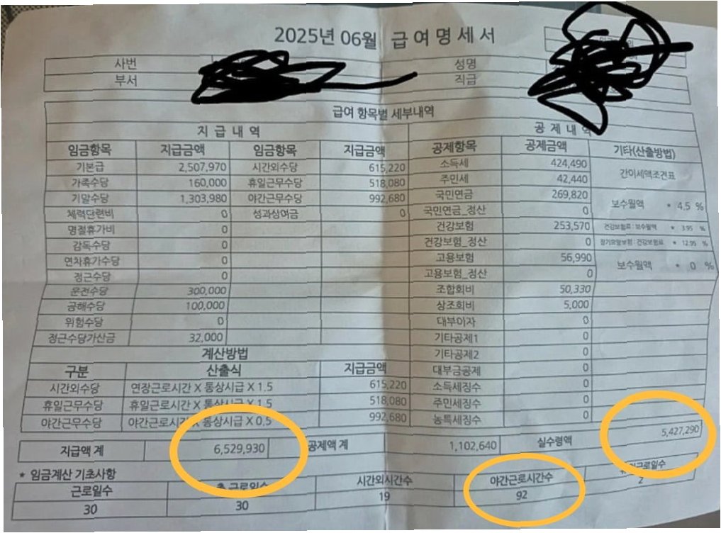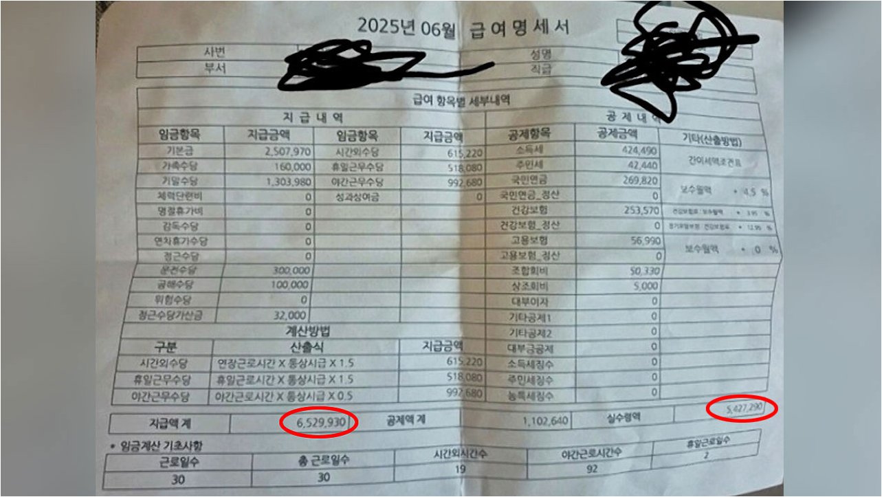 이번 달 A씨의 급여에는 기말수당 130만 원이 포함되었으며, 휴일을 포함한 야근과 시간 외 근무로 초과근무 수당만 212만 원이 추가되었습니다. 즉, 기말수당과 90시간 이상의 야근을 전제로 해야 500만 원대 실수령이 가능한 구조입니다. 이는 단순히 높은 월급만을 보고 섣불리 판단할 수 없는 이유를 보여줍니다.