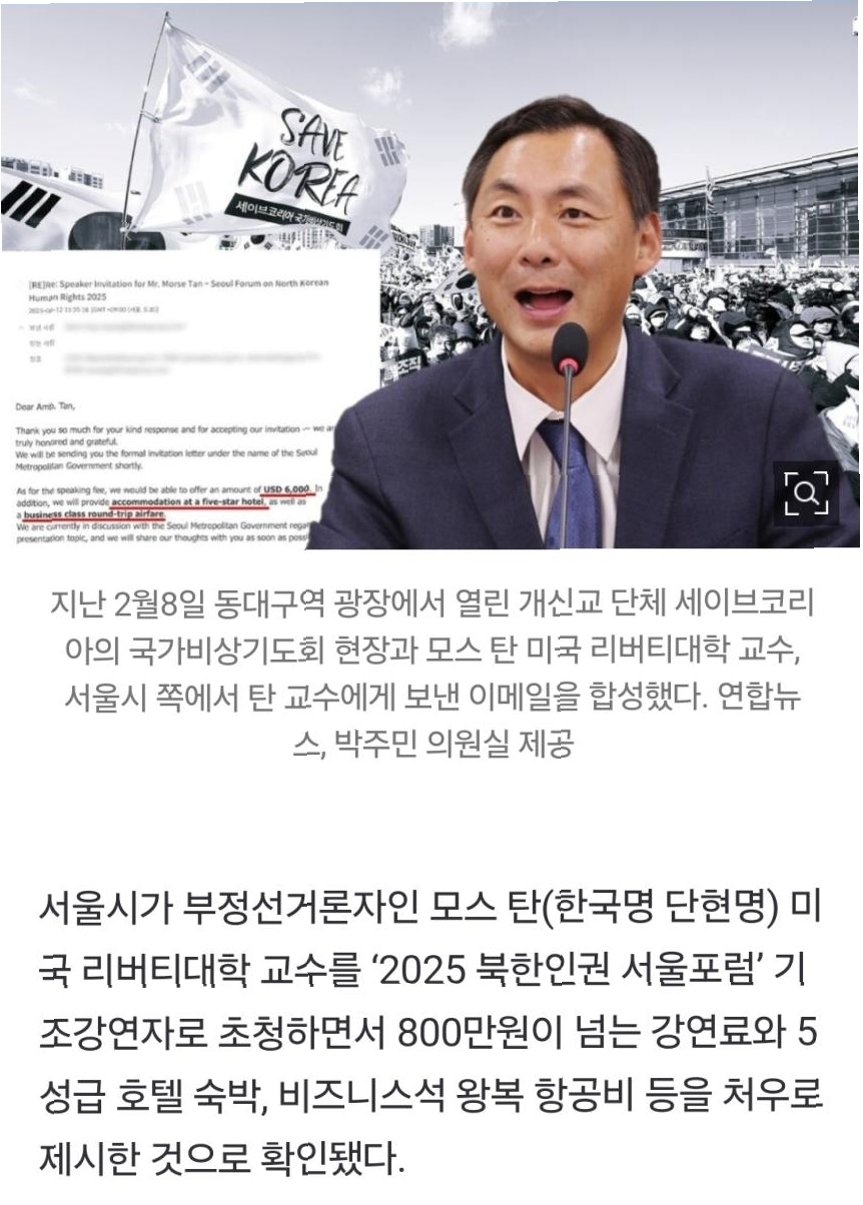서울시가 '2025 북한인권 서울포럼' 기조강연자로 모스 탄 교수를 초청하며 800만원이 넘는 강연료와 5성급 호텔 숙박, 비즈니스석 왕복 항공권을 제시한 사실이 드러나 논란이 일었습니다. 이는 박주민 더불어민주당 의원실이 확보한 이메일 내역을 통해 확인되었습니다. 포럼 사무국 위탁 업체인 K사는 탄 교수에게 초청 의사를 전달하며 강연료와 요구사항을 문의했고, 공공예산 지출을 언급하며 탄 교수의 기여를 높이 평가했습니다.