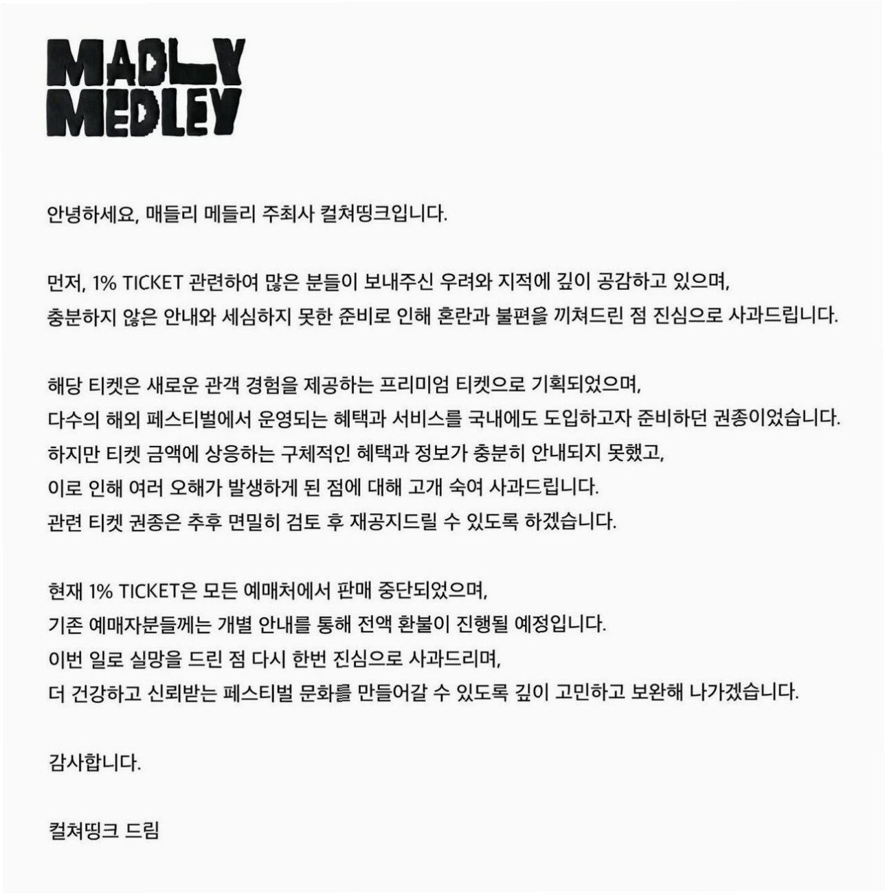 결국 '매들리 메들리' 측은 1% 티켓 관련 논란에 대해 사과하며 판매 중단을 결정했습니다. 주최 측은 '충분하지 않은 안내와 세심하지 못한 준비'를 이유로 들며, 티켓 금액에 상응하는 구체적인 혜택과 정보가 충분히 안내되지 못했음을 인정했습니다. 기존 예매자들에게는 개별 안내를 통해 전액 환불이 진행될 예정입니다.