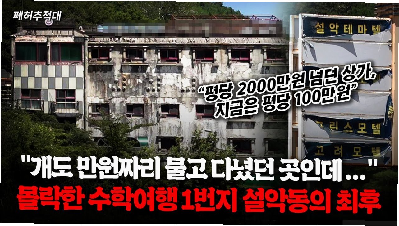 강원도 속초시 설악동 C지구가 폐업한 상점들로 인해 유령마을처럼 변했다는 소식입니다. 매년 300만 명이 방문하는 설악산국립공원의 대표 관문이라는 사실이 믿기 어려울 정도입니다. 운영을 중단한 리조트는 거대한 폐건물로 남았고, 광활한 주차장은 텅 비어 씁쓸함을 더합니다.