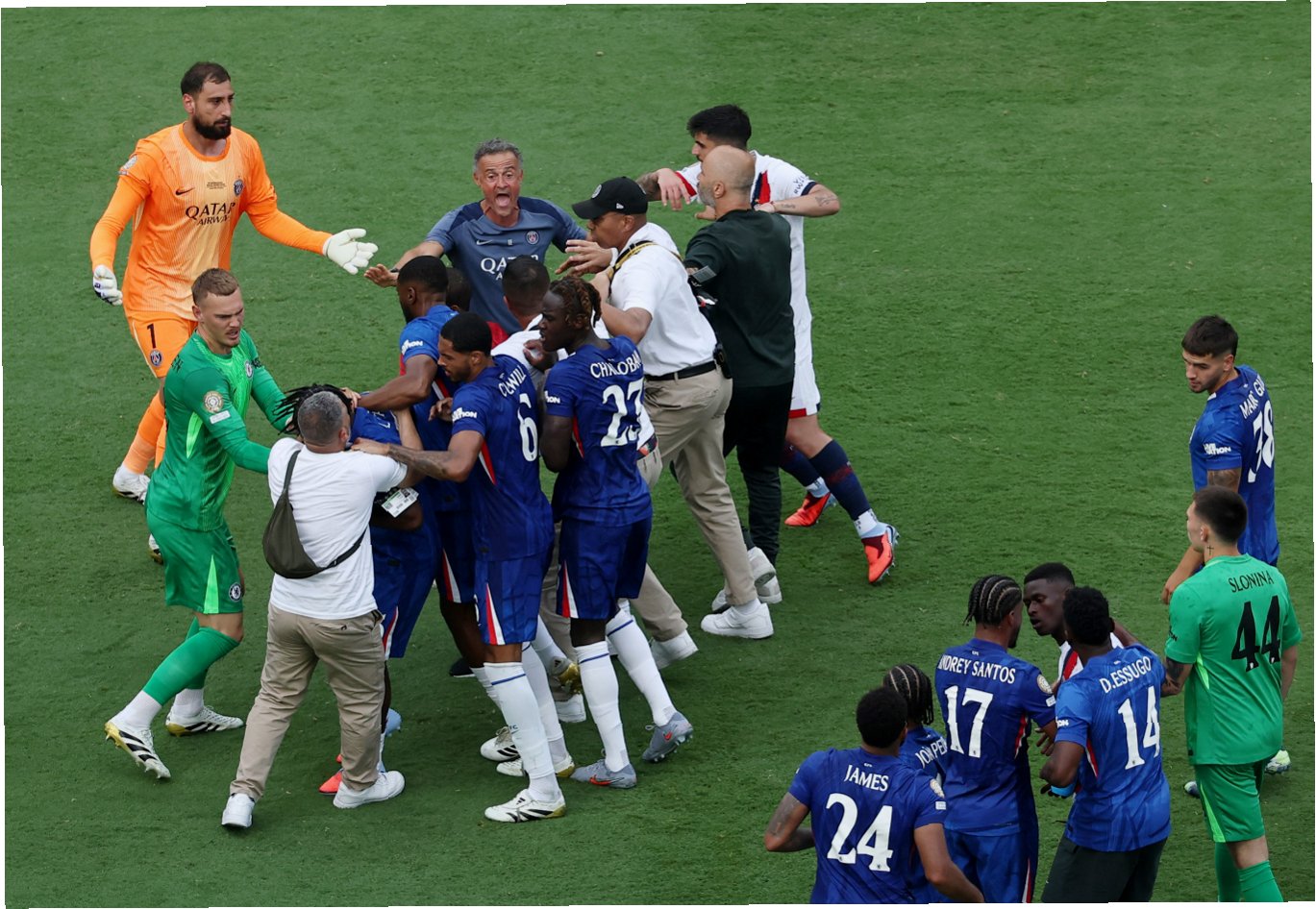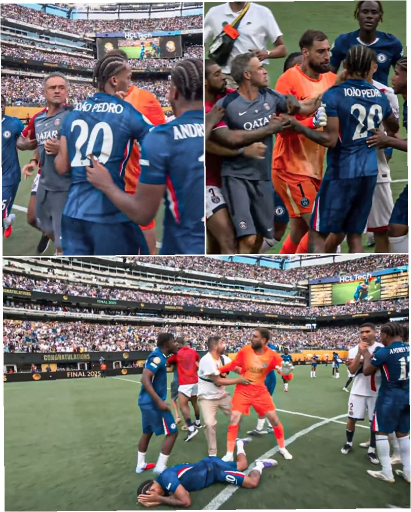 A.경기 종료 후, 첼시 선수와의 충돌 과정에서 엔리케 감독이 흥분하여 폭력적인 행동을 보였습니다. 이는 경기 결과에 대한 실망감과 감정 조절 실패로 인한 것으로 보입니다.