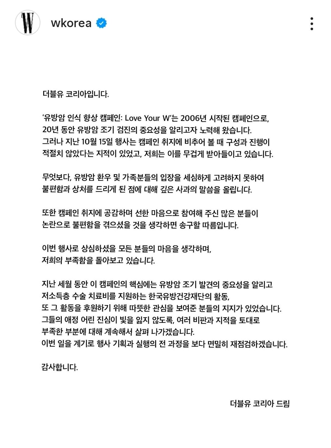 W코리아는 유방암 캠페인 기부금 관련 논란에 대해 공식 입장을 발표하고, 11억 원의 기부 사실을 명확히 했습니다. 기부금 산정 방식의 차이로 인해 발생한 오해를 해소하고, 투명한 정보 공개를 통해 신뢰를 회복하고자 노력했습니다. W코리아는 앞으로도 유방암 환우들을 위한 지원을 지속하고, 사회적 책임을 다하는 기업으로서의 역할을 다할 것입니다. 이번 사건을 통해 W코리아는 더욱 긍정적인 이미지를 구축하고, 유방암 문제 해결에 기여할 것으로 기대됩니다.