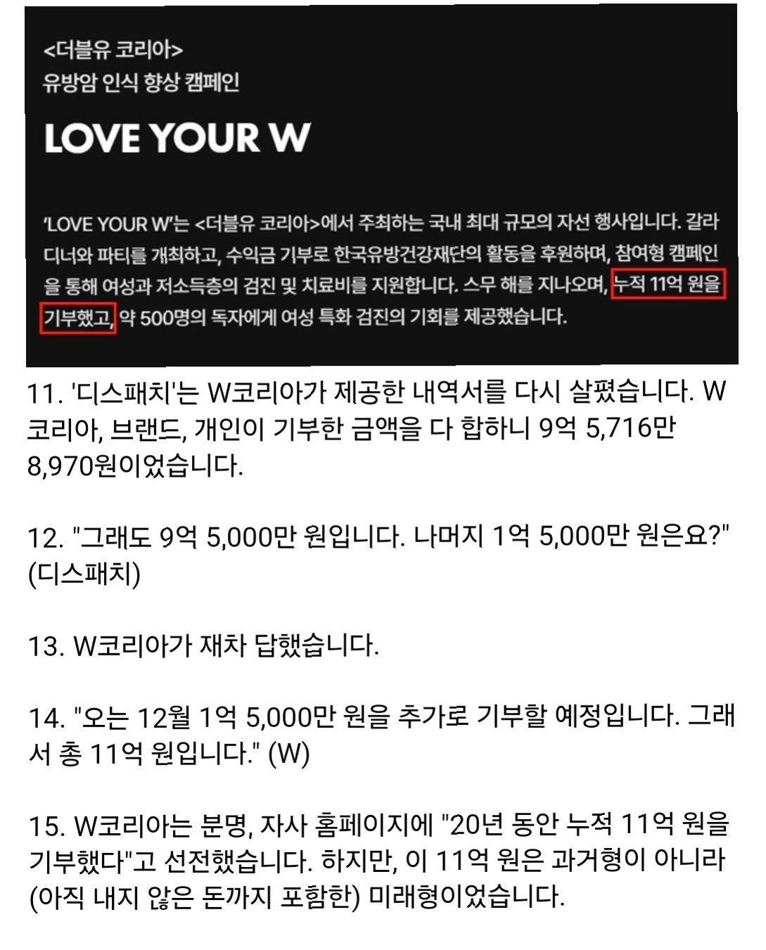 W코리아의 공식 입장 발표: 11억 원 기부 사실 재확인