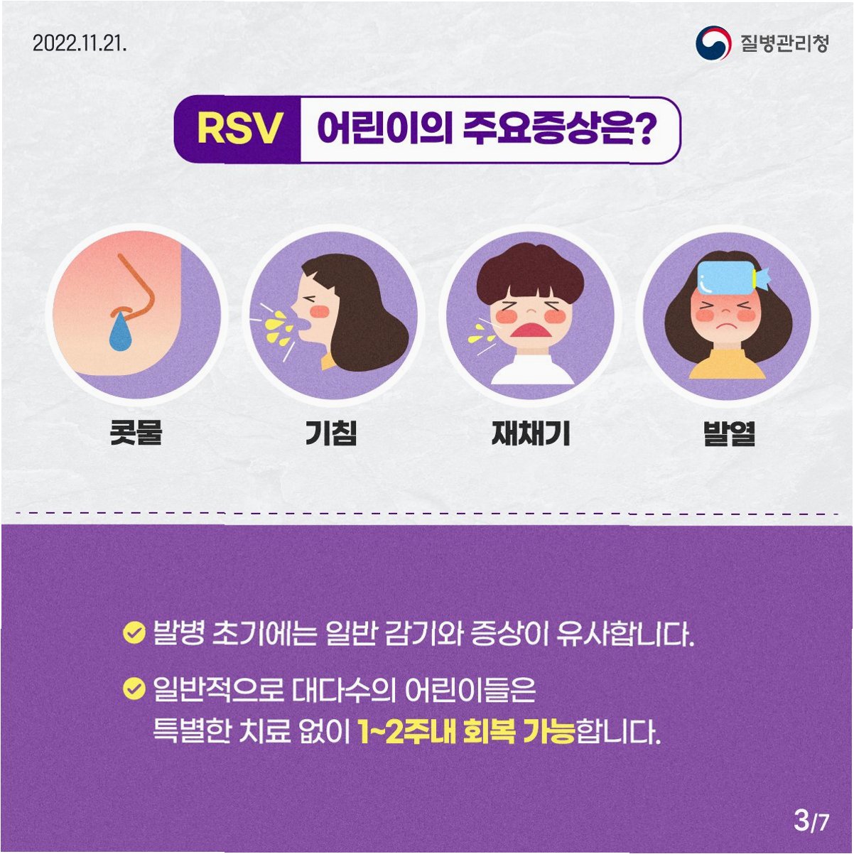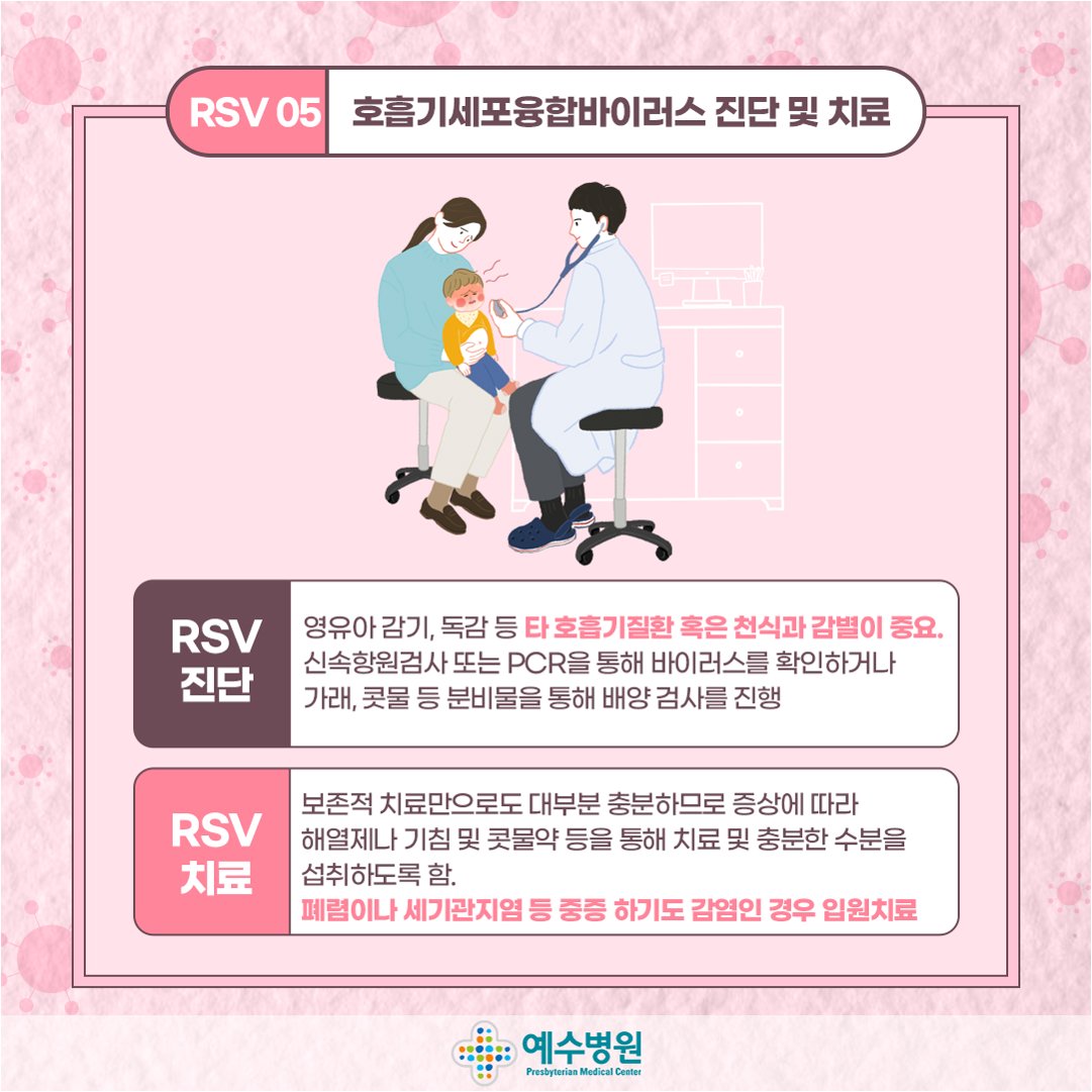 A.감기와 RSV는 증상이 유사하여, 자가 진단만으로 구분하기 어렵습니다. 병원 진료를 통해 정확한 진단을 받는 것이 좋습니다. 특히 영유아의 경우, 호흡 곤란 등의 증상이 나타나면 즉시 의료기관을 방문해야 합니다.