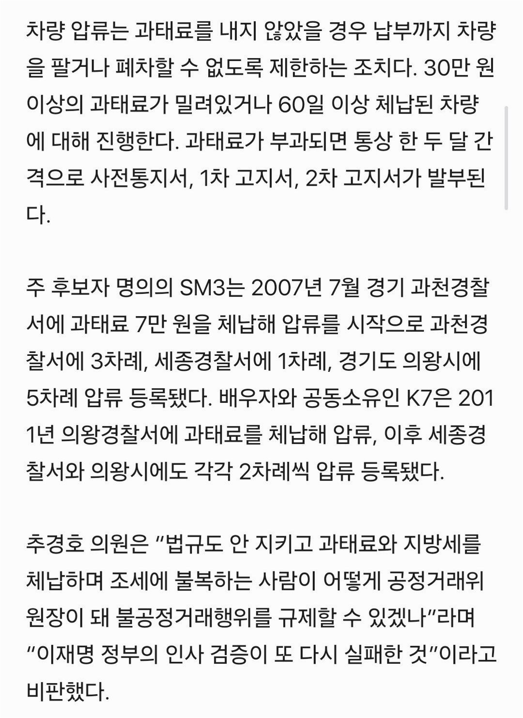 차량 압류는 과태료, 주정차 위반, 지방세 체납 등 법규 위반으로 인해 발생합니다. 특히 30만 원 이상의 과태료가 밀려있거나 60일 이상 체납된 차량에 대해 진행되는데, 주 후보자는 이러한 압류를 14차례나 겪었다는 것은 단순히 개인적인 문제를 넘어 공직자로서의 책임감 부족을 보여주는 지표가 될 수 있습니다.